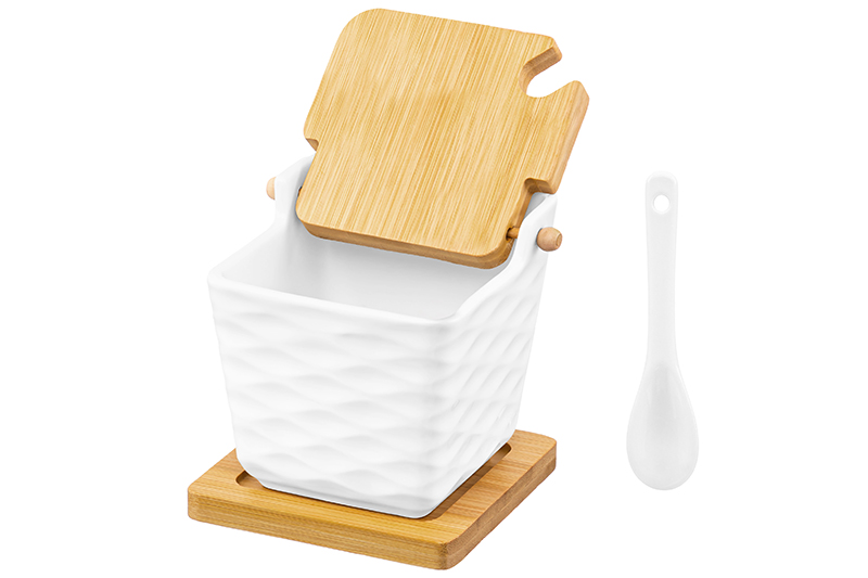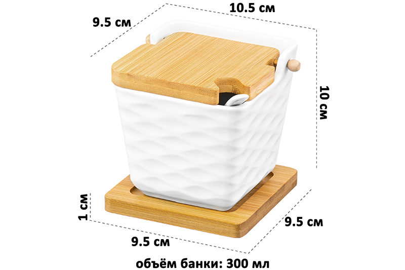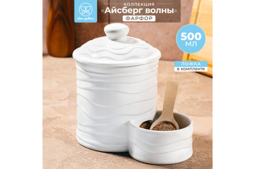 Банка для сыпучих продуктов Elan Gallery "Айсберг волны" объёмом 300 мл и размером 10,5х9,5х10 см выполнена из белого фарфора. Баночка имеет откидную крышку и съёмную подставку из натурального бамбука. Поставляется в комплекте с фарфоровой ложечкой. Ёмкость для сыпучих продуктов с ложкой станет удобным и эстетичным дополнением вашей кухни. Банка позволит не просто хранить чай, сахар или соль на вашей кухне, но и станет элементом её декора. Баночка с откидной бамбуковой крышечкой украсит интерьер любой кухни или столовой. Можно использовать для специй или приправ. Не рекомендуется применять абразивные моющие средства. Не использовать в микроволновой печи и посудомоечной машине. Бамбуковые детали нельзя замачивать! Поставляется в стильной картонной упаковке. Банка для сыпучих продуктов станет украшением вашей кухни или приятным подарком для родных и близких!