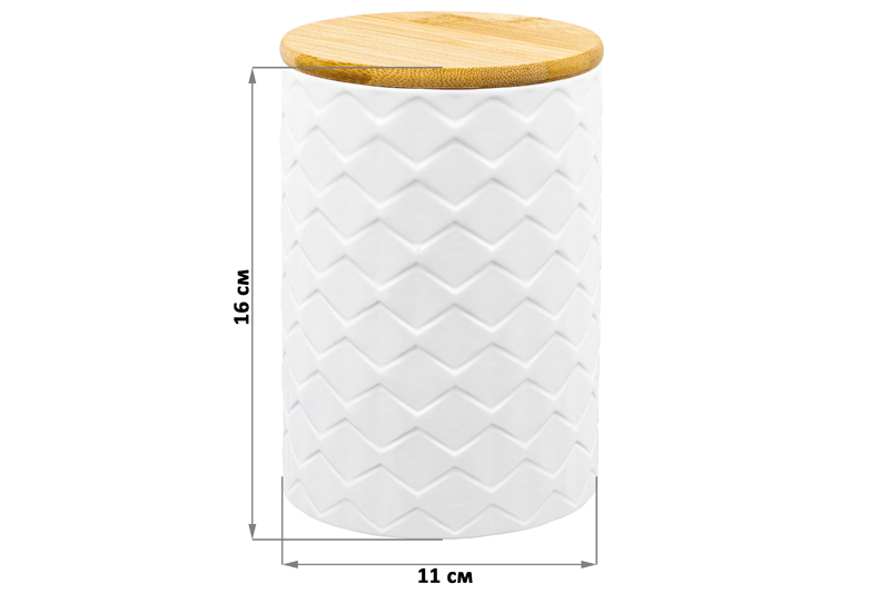 Банка “Аргайл” с деревянной крышкой предназначена для хранения разнообразных продуктов. Размер изделия – 11х11х16 см, объём – 1,1 литра. Баночка выполнена из керамики и опоясана рельефным геометрическим узором в виде несомкнутых ромбов. Она подойдёт для чая, кофе, сахара и соли. Заполните её специями и приправами, чтобы во время готовки всё необходимое было под рукой. Она также послужит для хранения круп и орехов, конфет, печений и других сладостей. Бамбуковая крышка с силиконовыми уплотнителями имеет плотную посадку и не даст содержимому просыпаться. Благодаря лаконичному дизайну банка впишется в интерьер любой кухни. Не рекомендуется применять абразивные моющие средства. Ёмкость без бамбуковых элементов можно использовать в посудомоечной машине и микроволновой печи. Бамбук нельзя замачивать. Поставляется в прочной картонной упаковке. Банка станет практичным подарком для любой хозяйки и отлично дополнит ваш кухонный инвентарь.