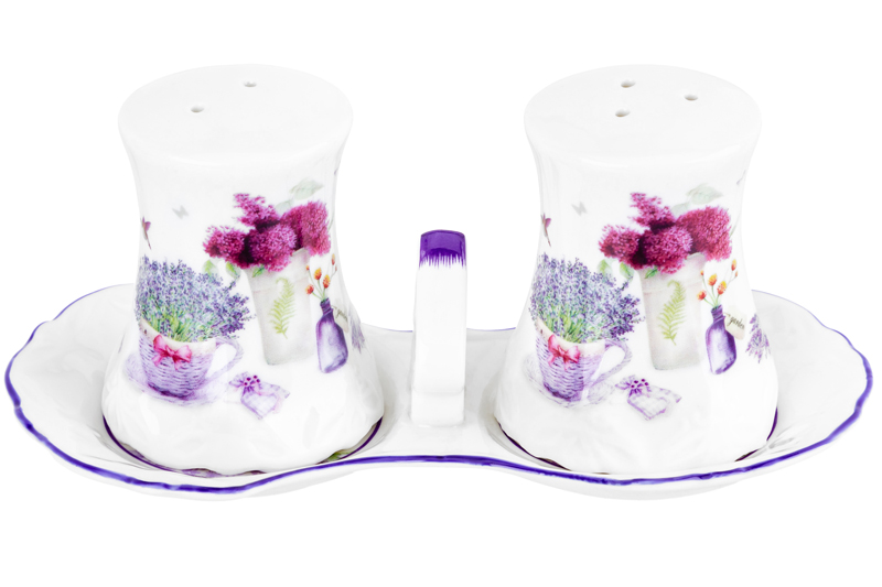 Набор для специй Elan Gallery "Лаванда" общим размером 16,5х9х7,5 см выполнен из фарфора нового поколения new bone china. Материал сочетает в себе изящность и высокую прочность. От других видов костяного фарфора отличается большей экологичностью в производстве. В набор входят: перечница, солонка и фарфоровая подставка. Размер каждой баночки 5,4х5,4х6,7 см, объём 50 мл. Серия "Лаванда" украшена нежным принтом на тему Прованса – французской провинции, которая славится своими лавандовыми полями и красивыми пейзажами. Изображение пышных букетов лаванды и гортензии позволит окунуться в атмосферу тепла, гармонии и южного солнца, не покидая вашей кухни или столовой! Фигурные ёмкости для соли и перца украсят обеденный стол в будни и помогут создать красивую сервировку праздничного стола. Посуда станет украшением интерьера кухни или столовой. Благодаря органайзерам на фарфоровой подставке вы можете устроить праздничный ужин у себя дома с сервировкой не хуже, чем в ресторане. Столовые принадлежности для эстетичного хранения соли, перца или приправ позволят держать всё необходимое под рукой в процессе приготовления еды. Можно использовать для любых сыпучих продуктов, например, корицы. Фарфоровые контейнеры наполняются через отверстия снизу, которые закрываются пластиковыми пробками. Пробки из пластика плотно прилегают и легко вынимаются. Не рекомендуется применять абразивные моющие средства. Декоративные баночки и подставку можно использовать в посудомоечной машине. Настольный комплект поставляется в стильной картонной коробке. Красивый кухонный инвентарь станет чудесным подарком на любой праздник! Благодаря красочной коробочке не понадобится дополнительная подарочная упаковка. В коллекции бренда Elan Gallery вы найдёте много красивых кухонных аксессуаров и предметов декора, выберите вариант на свой вкус.