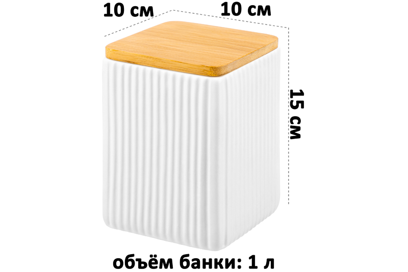Банка от Elan Gallery предназначена для организации хранения продуктов на вашей кухне. Размер ёмкости – 10х10х15 см, объём – 1 литр. Выполнена из керамики и имеет белый цвет, поверхность украшена рельефом из крупных вертикальных полос. Крышка выполнена из натурального бамбука и оснащена силиконовым уплотнителем. Изделие отлично подойдёт для хранения сыпучих продуктов: сахара и соли, чая и кофе, приправ и специй. Храните в баночке ягоды, орехи и сухофрукты. Заполните её любимыми сладостями: леденцами, конфетами или печеньем. Подайте к столу, чтобы идеально дополнить чайную сервировку! Герметичная деревянная крышечка защитит ваши продукты от попадания грязи и пыли. Коллекция из двух баночек лаконичных цветов впишется в любой интерьер и позволит организовать хранение даже на открытых полках. Не рекомендуется применять абразивные моющие средства. Не подходит для использования в микроволновой печи. Без бамбуковой крышки подходит для посудомоечной машины. Бамбук нельзя замачивать! Поставляется в дизайнерской картонной коробке – благодаря ей вам не потребуется дополнительная подарочная упаковка. Это идеальный подарок для хозяйки, ценящей не только практичность, но и стиль. В ассортименте бренда Элан Галерея представлены банки для хранения на любой вкус. Соберите целый набор кухонных контейнеров для эстетичного хранения продуктов на вашей кухне!