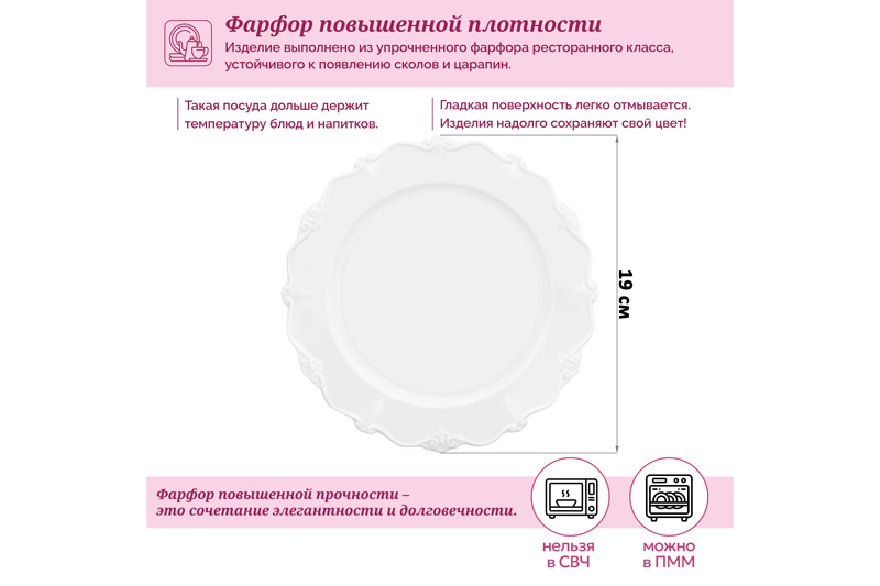 Набор 2 тарелок из серии «Галант» предназначен для подачи разнообразных угощений. Размер каждой тарелки – 19х19х1,5 см. Выполнены из высококачественного белого фарфора и украшены ажурной каймой. Фарфор не впитывает цвет продуктов и надолго сохранит свою нежную белизну. Изделия дополнят любой интерьер и привнесут в ваш дом атмосферу французской утончённости. Они подойдут для подачи кулинарных изделий: горячих и холодных блюд, закусок, десертов, овощных и фруктовых салатов. Каждая тарелка станет незаменимым элементом сервировки завтрака, ужина и вторых блюд на обед. Разместите на ней любимую еду, от блинов до пасты. На ней будет хорошо смотреться выпечка или сыр для быстрого перекуса. Не рекомендуется применять абразивные моющие средства. Подойдёт для использования в посудомоечной машине и микроволновой печи. Поставляется в красивой картонной коробке – благодаря ей вам не потребуется дополнительная подарочная упаковка. Это идеальный подарок для хозяйки, ценящей не только практичность, но и стиль. Фарфоровая коллекция «Галант» позволит создать сервировку, как в лучших домах Парижа!