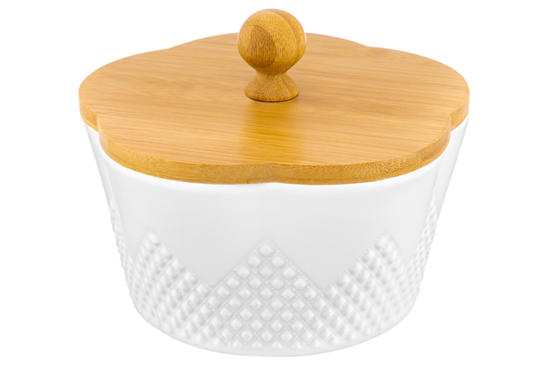 Банка для печенья из серии «Ромбики» предназначена для эстетичной сервировки вашего стола. Размер изделия – 14,8х14,8х11,5 см, объём – 760 мл. Выполнена из высококачественного белого фарфора в форме цветка и украшена рельефным геометрическим узором. Крышка выполнена из натурального бамбука. Фарфор легко отмывается и не впитывает цвет продуктов, благодаря чему надолго сохранит свою белизну. Красивая ёмкость станет не только функциональным, но и эстетичным дополнением вашего кухонного инвентаря. Наполните баночку любимым печеньем: бисквитным, сахарным или творожным. Послужит в качестве конфетницы: сложите в неё конфеты, шоколад, маленькие пирожные, пряники или любые другие сладости и выпечку. Наполните десертную вазочку большой порцией мороженного или разными десертами, чтобы разделить угощение с семьёй или друзьями. Используйте для подачи закусок: ягод, орехов, кусочков сыра или фруктов. Заполните дольками лимона, чтобы добавлять их в чай. Подойдёт для хранения сыпучих продуктов: кофе, сахара и соли, специй и приправ. Компактный контейнер удобно хранить в шкафчиках и на полках. Крышка сервировочной баночки имеет свободную посадку, чтобы вы могли легко и быстро открывать её. Она достаточно герметична, чтобы обеспечить сохранность продуктов. Благодаря стильному и лаконичному дизайну изделие гармонично впишется в интерьер любой кухни. Не рекомендуется применять абразивные моющие средства. Без бамбуковой крышки подходит для использования в посудомоечной машине и микроволновой печи. Бамбук нельзя замачивать. Поставляется в дизайнерской картонной коробке – благодаря ей вам не потребуется дополнительная подарочная упаковка. Посуда из серии «Ромбики» станет отличным подарком для хозяйки, ценящей не только практичность, но и стиль, и поможет собрать сервиз в едином стиле.