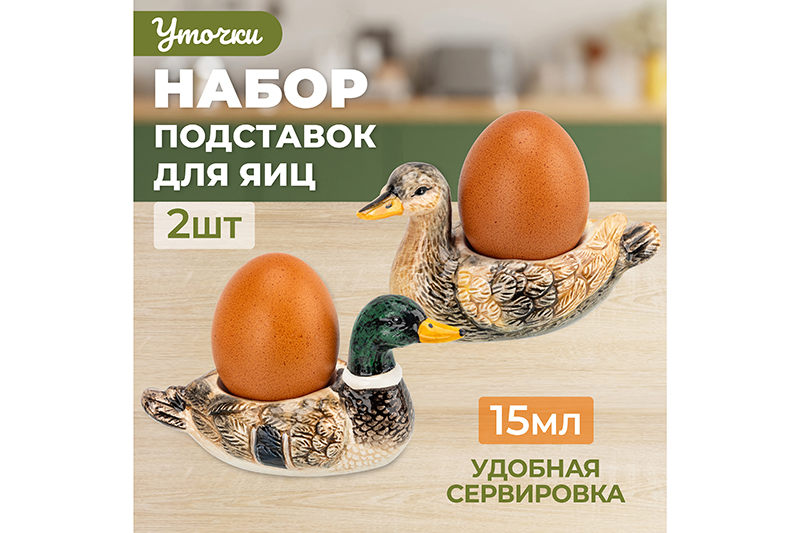 Набор 2 подставок для яиц Elan Gallery "Селезень и уточка" поможет эстетично сервировать стол на завтрак, обед и ужин. Размер одной подставки под яйцо — 11,5х5,8х6,5 см, объём ёмкости — 15 мл. Комплект в виде красивых детализированных фигурок уточек выполнен из керамики. Такая вещь станет предметом декора и настоящим украшением вашей кухни или столовой. Светлая Пасха – один из главных праздников весны! Мы разработали коллекцию сезонных товаров для дома, которые помогут создать радостную и уютную атмосферу в квартире или на даче. Пасхальный декор преобразит домашний интерьер и поможет встретить праздник в кругу любимых. Керамический держатель в виде птички – красивое приспособление для изящной сервировки куриного яйца, сваренного вкрутую или всмятку. Он поднимет настроение взрослым и детям. Яичную подставку можно использовать в роли соусника – под любой соус. Пашотница подойдёт для создания декоративных композиций с крашеными яичками и украшения пасхального стола. Не рекомендуется применять абразивные моющие средства. Нельзя использовать в микроволновой печи и посудомоечной машине. Кухонный инвентарь для изящной подачи блюд поставляется в яркой картонной коробке. Благодаря красочной коробочке не понадобится дополнительная подарочная упаковка. Сервировочная формочка станет приятным сюрпризом на любой праздник и может быть использована в роли соусницы. Комплект настольных подставок для яиц станет украшением интерьера вашей кухни и поможет создать дома тепло и уют. В коллекции бренда Elan Gallery вы найдёте множество как ярких, так и нежных декоративных украшений – каждый обязательно подберёт сувенир на свой вкус. Они станут чудесным подарком для родных, близких и коллег. Наполните пространство вокруг себя радостью и весенним настроением!