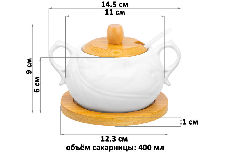 Сахарница с ложкой и бамбуковой крышкой из серии «Айсберг» объемом 400 мл выполнена из качественного фарфора. Имеет в комплекте подставку из бамбука диаметром 12,3 см. Изящный рельефный рисунок, фигурные ручки и удобство использования делают эту сахарницу желанным подарком любой хозяйке. У банки широкое горло, которое удобно мыть, а бамбуковая крышка защитит сахар или другие сыпучие продукты от влаги. Баночка с ложечкой подойдёт не только для хранения сахара, но и мёда, варенья или джема. Ёмкость можно использовать для красивой подачи икры. В серии фарфоровой посуды с использованием бамбука представлен широкий ассортимент товаров для сервировки стола, которые, несомненно, впишутся в любой интерьер благодаря лаконичному дизайну, натуральным материалам и высокой функциональности. Без бамбуковых крышки и подставки можно использовать в ПММ и СВЧ. Бамбук нельзя замачивать! Поставляется в картонной упаковке. Красивому комплекту из сахарницы и подставки будет рада любая хозяйка!