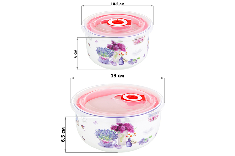 Набор Elan Gallery из серии "Лаванда" состоит из 2 салатников с пластиковыми крышками разного объема: 560 мл и 260 мл. Контейнеры подойдут для сервировки, транспортировки и помогут компактно хранить продукты. Размеры кухонных ёмкостей 13х13х6,5 см и 10,5х10,5х6 см. Пустые чаши можно компактно хранить друг в друге. Комплект выполнен из высококачественного фарфора new bone china. New bone china сочетает в себе изящность и высокую прочность. От других видов костяного фарфора материал отличается большей экологичностью в производстве. Крышки на глубоких блюдах выполнены из пищевого пластика полипропилена и имеют силиконовые уплотнители. Пищевой пластик не выделяет вредных веществ и безопасен для здоровья. Фарфоровые миски имеют на крышечках клапаны для контроля воздуха внутри и календарные индикаторы. Можно отслеживать, сколько дней хранится пища в салатниках. Серия "Лаванда" украшена нежным принтом на тему Прованса – французской провинции, которая славится своими лавандовыми полями и красивыми пейзажами. Изображение пышных букетов лаванды и гортензии позволит окунуться в атмосферу тепла, гармонии и южного солнца, не покидая вашей кухни или столовой! Универсальный инвентарь подходит для хранения в холодильнике и транспортировки готовых блюд. Благодаря красочному дизайну подходит для подачи салатов на стол. За счёт глубокой формы миски удобны для смешивания ингредиентов. Можно использовать для различной еды на даче и пикнике. Не рекомендуется применять абразивные моющие средства. С открытым клапаном на крышке можно использовать в микроволновой печи. Можно мыть в посудомоечной машине. Набор поставляется в яркой картонной упаковке. Салатники из серии посуды "Лаванда" станут украшением вашей кухни или приятным подарком на любой праздник. Благодаря стильной коробочке не понадобится подарочная упаковка. В коллекции бренда Elan Gallery можно найти сервировочные блюда, тарелки и ёмкости для хранения на любой вкус. Ознакомьтесь со всем ассортиментом товаров для дома.