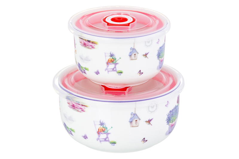 Набор Elan Gallery из серии "Лаванда" состоит из 2 салатников с пластиковыми крышками разного объема: 560 мл и 260 мл. Контейнеры подойдут для сервировки, транспортировки и помогут компактно хранить продукты. Размеры кухонных ёмкостей 13х13х6,5 см и 10,5х10,5х6 см. Пустые чаши можно компактно хранить друг в друге. Комплект выполнен из высококачественного фарфора new bone china. New bone china сочетает в себе изящность и высокую прочность. От других видов костяного фарфора материал отличается большей экологичностью в производстве. Крышки на глубоких блюдах выполнены из пищевого пластика полипропилена и имеют силиконовые уплотнители. Пищевой пластик не выделяет вредных веществ и безопасен для здоровья. Фарфоровые миски имеют на крышечках клапаны для контроля воздуха внутри и календарные индикаторы. Можно отслеживать, сколько дней хранится пища в салатниках. Серия "Лаванда" украшена нежным принтом на тему Прованса – французской провинции, которая славится своими лавандовыми полями и красивыми пейзажами. Изображение пышных букетов лаванды и гортензии позволит окунуться в атмосферу тепла, гармонии и южного солнца, не покидая вашей кухни или столовой! Универсальный инвентарь подходит для хранения в холодильнике и транспортировки готовых блюд. Благодаря красочному дизайну подходит для подачи салатов на стол. За счёт глубокой формы миски удобны для смешивания ингредиентов. Можно использовать для различной еды на даче и пикнике. Не рекомендуется применять абразивные моющие средства. С открытым клапаном на крышке можно использовать в микроволновой печи. Можно мыть в посудомоечной машине. Набор поставляется в яркой картонной упаковке. Салатники из серии посуды "Лаванда" станут украшением вашей кухни или приятным подарком на любой праздник. Благодаря стильной коробочке не понадобится подарочная упаковка. В коллекции бренда Elan Gallery можно найти сервировочные блюда, тарелки и ёмкости для хранения на любой вкус. Ознакомьтесь со всем ассортиментом товаров для дома.