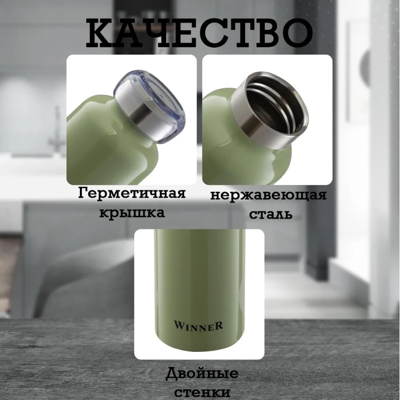 Термобутылка объемом 500 мл. Размер 7,3*20,4 см. Стенки двойные. Корпус зеленого цвета, внутри и снаружи нержавеющая сталь. Закручивающаяся крышка. Рекомендована ручная чистка. Состав: нержавеющая сталь.