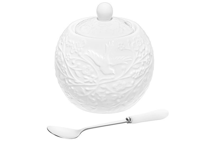 Сахарница с металлической ложкой из серии "Райский сад" от бренда Elan Gallery предназначена для красивой сервировки вашего стола. Можно использовать в роли икорницы или медовницы. Размер ёмкости – 11х11х12 см, объём – 500 мл. Размер ложечки – 13 см. Банка для сахара выполнена из высококачественного белого фарфора. Материал не впитывает цвет продуктов и легко отмывается, благодаря чему надолго сохраняет свою белизну. Поверхность изделия украшают изящные рельефные узоры с изображениями птиц и лиственных веточек. Декоративная баночка добавит особого шарма любой сервировке. Ёмкость подойдёт для хранения любых сыпучих продуктов: соли, специй и приправ. Можно приспособить в роли горшочка для красивой подачи варенья, мёда или икры. Маленькая ложечка позволит удобно набрать необходимое количество продукта. Она компактно помещается в круглой банке благодаря выемке на крышке. Декоративное изделие отлично дополнит сервировку стола как для сытного завтрака, так и для уютного чаепития. Не рекомендуется применять абразивные моющие средства. Без ложки подходит для использования в посудомоечной машине и микроволновой печи. Поставляется в дизайнерской картонной коробке – благодаря ей вам не потребуется дополнительная подарочная упаковка. Фарфоровая сервировочная посуда станет приятным подарком на любой праздник для тех, кто ценит практичность и привлекательность. Серия "Райский сад" от бренда Элан Галерея станет украшением любого кухонного инвентаря и позволит собрать красивый сервиз в едином стиле!