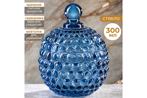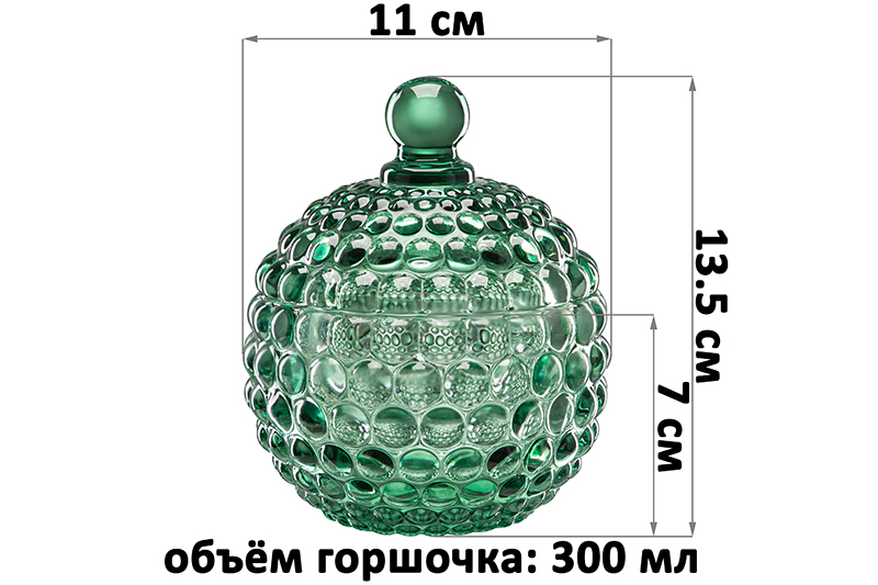 Горшочек для мёда Elan Gallery "Пузырьки" с крышкой выполнен из стекла и украшен декоративным рельефным узором. Размер изделия – 11х11х13,5 см, объём – 300 мл. Высота без крышки – 7 см. Интересная баночка зелёного цвета подойдёт для хранения мёда, варенья, сахара и соли. Можно использовать её как ёмкость для чая, кофе и других сыпучих продуктов. Декоративная баночка круглой формы станет гармоничным дополнением при сервировке вашего стола как в будни, так и на праздник. Красивый дизайн позволит использовать её не только для хранения продуктов, но и для подачи на стол. Положите в неё конфеты или икру, чтобы удивить гостей изящной сервировкой. Стеклянную ёмкость с крышечкой можно использовать не только как сахарницу, икорницу или соусник, но и для специй и приправ. Это позволит держать под рукой всё необходимое во время приготовления и приёма пищи. На даче медовница будет незаменимой для семейного чаепития, а также подойдёт для подачи ягод. В качестве альтернативы красивую вазочку с крышкой можно использовать как шкатулку или органайзер. Сложите в неё украшения и любые маленькие предметы. Подходит в роли стакана для свечи. Не рекомендуется применять абразивные моющие средства. Нельзя использовать в посудомоечной машине и микроволновой печи. Поставляется в стильной картонной упаковке. Красивая посуда – это отличный подарок на любой праздник. Медовый бочонок "Пузырьки" станет многофункциональным дополнением вашего кухонного инвентаря и украсит домашний интерьер!