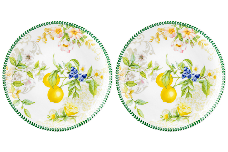 Набор 2 круглых тарелок Elan Gallery "Лимоны" выполнен из фарфора new bone china, сочетающего в себе изящность и высокую прочность. Размер каждого изделия — 16х16х2 см. За счёт гладкости изделия легко отмываются, поэтому долго сохраняют привлекательный вид и практичны в использовании. Плотная структура материала позволяет посуде дольше сохранять температуру блюд и напитков. От других видов костяного фарфора new bone china отличается большей экологичностью в производстве. Фарфоровая посуда с ярким рисунком в виде лимонов станет изящным дополнением интерьера любой кухни или столовой. Удобно использовать для десерта. Пирожковые тарелочки станут украшением интерьера кухни или гостиной. Положите на сервировочное блюдце кусочек торта, домашнего пирога или пирожное. Небольшая тарелочка подойдёт для подачи закусок: сырной нарезки, сырокопчёной колбасы или свежих овощей и зелени. Разместите на десертном блюде выпечку и сыр, чтобы перекусить за чашечкой кофе на завтрак. Фарфоровая посуда отличается от керамической повышенной плотностью. Фарфор не впитывает цвет продуктов и не деформируется от влаги, чему может быть подвержена керамика. Блюдечко легко отмывается и долго сохраняет привлекательный вид. Маленькие блюдца для сладостей восхитят ваших гостей и добавят элегантности при сервировке стола как в будни, так и на праздник. Не рекомендуется применять абразивные моющие средства. Подходят для использования в посудомоечной машине и микроволновой печи. Поставляются в красивой картонной коробке – благодаря ей вам не потребуется дополнительная подарочная упаковка. Набор станет оригинальным подарком для любой хозяйки и незаменимым элементом сервировочного инвентаря в вашем доме!