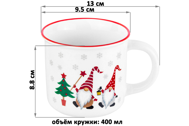 Набор 2 кружек Elan Gallery "Весёлые гномики" объёмом по 400 мл выполнен из фарфора нового поколения new bone china. Благодаря современным технологиям он не уступает другим видам фарфора в прочности, но при этом экологичнее в производстве. Каждая кружечка украшена ярким изображением гномов в новогодних колпачках. Кружки с принтом подходят ценителям чая и кофе, которые любят пить из красивой и необычной посуды. Отлично подойдут как для женщин, так и для мужчин. Это идеальный вариант для того, чтобы согреться горячим напитком зимой и освежиться прохладным лимонадом летом. Интересная кружка с удобной ручкой и красным ободком (кантом) украсит ваш стол своим оригинальным дизайном как на праздник, так и в будни. Посуда из фарфора с рисунком идеально впишется в любой интерьер вашей кухни. Не рекомендуется применять абразивные моющие средства. Можно использовать в микроволновой печи и посудомоечной машине. Поставляется в картонной коробке. Фарфоровая посуда – хороший вариант подарка близким людям, друзьям или коллегам. Благодаря яркому дизайну коробочки вам не потребуется дополнительная подарочная упаковка. Чайная или кофейная кружка – отличный сюрприз для ценителей красивой дизайнерской посуды. Наслаждайтесь любимыми напитками из этих декоративных бокалов каждый день или подарите родным на Новый год, Рождество или любой другой праздник. В коллекции Elan Gallery вы можете найти много сувениров, красивой посуды и товаров для дома, чтобы создать комфорт и уют в любом пространстве! Выберите бокал или чашку от нашего бренда на свой вкус.