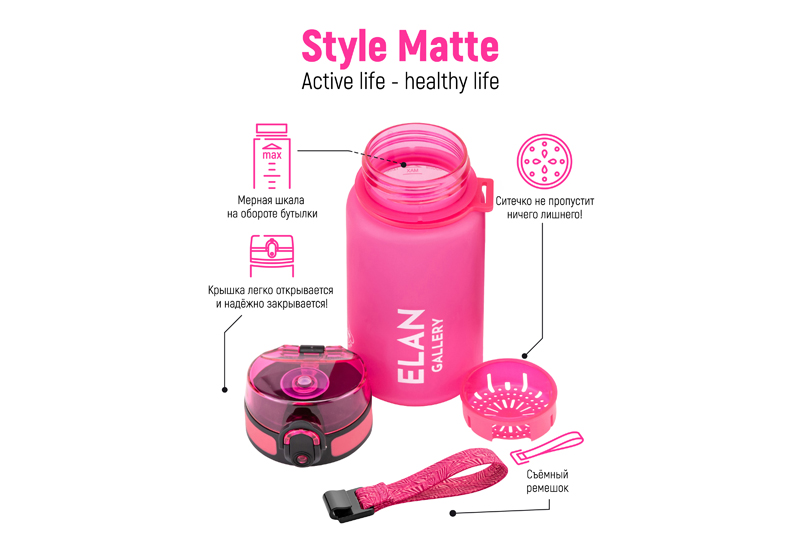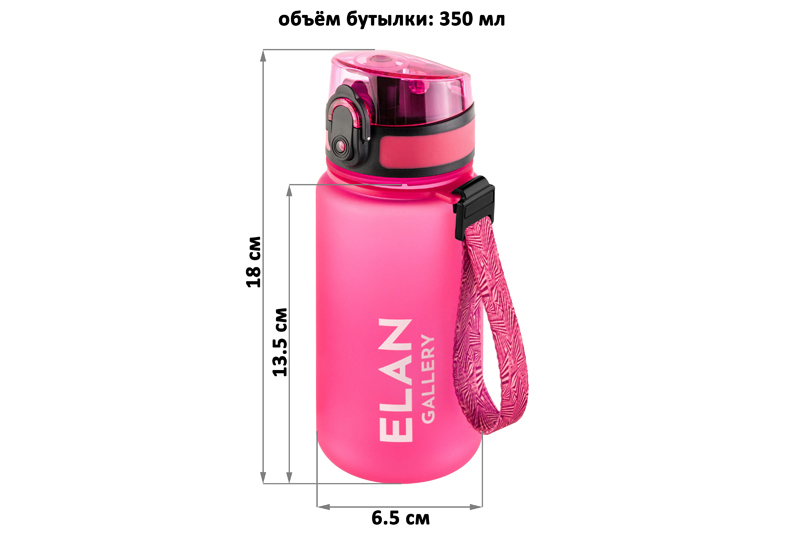 Бутылка для воды «Style Matte» от Elan Gallery – это практичное и стильное решение для ценителей активного образа жизни. Размер ёмкости – 6,8х6,8х17 см. Высота до крышки – 12,5 см. Объём – 350 мл. Изделие выполнено из тритана – прочного, безопасного материала, не содержащего бисфенол А. Этот пластик не впитывает запахи и не влияет на вкус напитков. Бутылочка подходит как для холодной, так и для горячей жидкости. Освежитесь любимыми летними напитками в жару или согрейтесь ароматным чаем зимой! Матовое покрытие обеспечивает комфортное использование на прогулке, в офисе и на тренировке в зале. Надёжная крышка с герметичным клапаном препятствует проливанию, а встроенное ситечко позволит заваривать напитки с травами и фруктами. С удобным ремешком бутылку можно закрепить на рюкзаке или запястье – это позволяет брать её в путешествия, поездку на велосипеде или автомобиле. Многоразовая дорожная бутылка подходит как для туризма, так и для пикника на природе. Удобная форма делает её не только туристическим, но и спортивным инвентарём. Пластиковая ёмкость для питья – прекрасный вариант для занятий фитнесом, йогой или бегом в спортзале или на свежем воздухе. Она также дополнит занятия велоспортом в качестве велосипедного аксессуара. Это надёжный помощник спортсменам во время игры в футбол или волейбол, занятий гимнастикой и танцами. Подходит как для взрослых, так и для школьников – её можно взять в школу и на занятия физкультурой. Благодаря универсальному дизайну и цвету фуксия она подойдёт как девочкам, так и мальчикам в качестве школьного аксессуара. Функциональная бутылка в дизайнерской картонной упаковке – это готовый подарок для женщин и мужчин. Не подходит для микроволновой печи, посудомоечной машины и стерилизатора. В коллекции бренда Элан Галерея представлена разнообразная посуда и товары для дома на любой вкус. Спортивные аксессуары из серии «Style Matte» помогут следить за водным балансом, где бы вы ни находились!