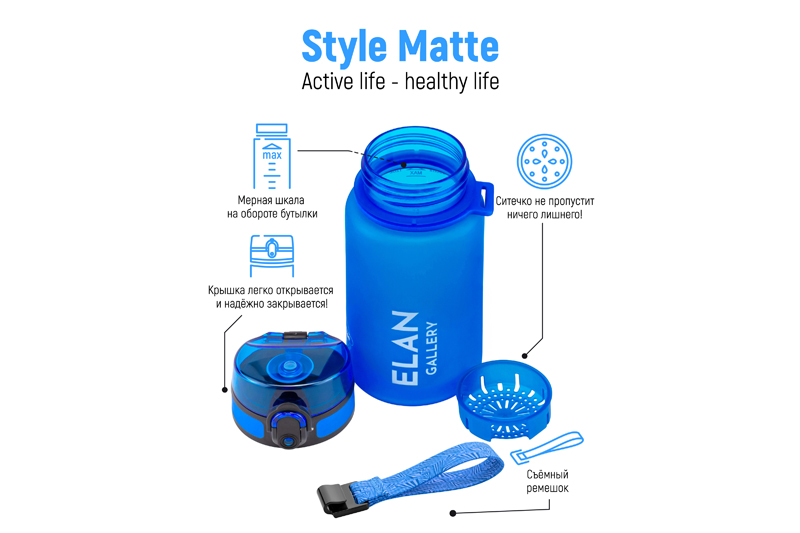 Бутылка для воды «Style Matte» от Elan Gallery – это практичное и стильное решение для ценителей активного образа жизни. Размер ёмкости – 6,8х6,8х17 см. Высота до крышки – 12,5 см. Объём – 350 мл. Изделие выполнено из тритана – прочного, безопасного материала, не содержащего бисфенол А. Этот пластик не впитывает запахи и не влияет на вкус напитков. Бутылочка подходит как для холодной, так и для горячей жидкости. Освежитесь любимыми летними напитками в жару или согрейтесь ароматным чаем зимой! Матовое покрытие обеспечивает комфортное использование на прогулке, в офисе и на тренировке в зале. Надёжная крышка с герметичным клапаном препятствует проливанию, а встроенное ситечко позволит заваривать напитки с травами и фруктами. С удобным ремешком бутылку можно закрепить на рюкзаке или запястье – это позволяет брать её в путешествия, поездку на велосипеде или автомобиле. Многоразовая дорожная бутылка подходит как для туризма, так и для пикника на природе. Удобная форма делает её не только туристическим, но и спортивным инвентарём. Пластиковая ёмкость для питья – прекрасный вариант для занятий фитнесом, йогой или бегом в спортзале или на свежем воздухе. Она также дополнит занятия велоспортом в качестве велосипедного аксессуара. Это надёжный помощник спортсменам во время игры в футбол или волейбол, занятий гимнастикой и танцами. Подходит как для взрослых, так и для школьников – её можно взять в школу и на занятия физкультурой. Благодаря универсальному дизайну и небесному цвету она подойдёт как девочкам, так и мальчикам в качестве школьного аксессуара. Функциональная бутылка в дизайнерской картонной упаковке – это готовый подарок для женщин и мужчин. Не подходит для микроволновой печи, посудомоечной машины и стерилизатора. В коллекции бренда Элан Галерея представлена разнообразная посуда и товары для дома на любой вкус. Спортивные аксессуары из серии «Style Matte» помогут следить за водным балансом, где бы вы ни находились!