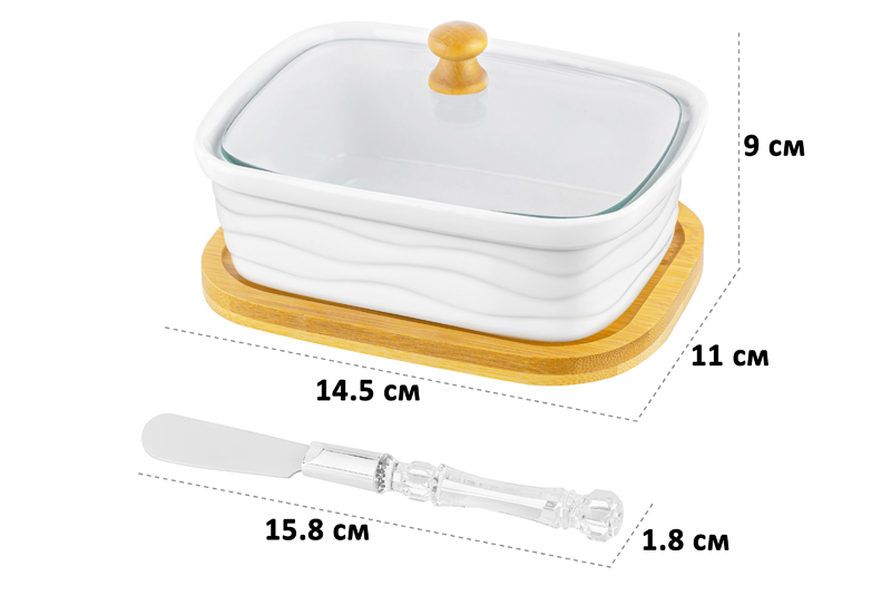 Паштетница серии "Айсберг волны" размером 14,5х11х9 см и объёмом 330 мл со стеклянной крышкой выполнена из качественного фарфора. Имеет в комплекте нож и бамбуковую подставку. Ручка из бамбука на крышке паштетницы прекрасно ложится в руку и не выскальзывает. Паштетница эстетично смотрится на столе и украсит любую сервировку. Глубокую фарфоровую ёмкость можно использовать для хранения в холодильнике не только паштета, но и сыра, масла и других продуктов. Не рекомендуется использовать абразивные моющие средства. Без крышки и бамбуковой подставки фарфоровую ёмкость можно мыть в посудомоечной машине (ПММ). Бамбук нельзя замачивать! Красивый кухонный инвентарь станет отличным подарком для любой хозяйки. В серии фарфоровой посуды с использованием бамбука представлен широкий ассортимент товаров для сервировки стола, которые, несомненно, впишутся в любой интерьер благодаря лаконичному дизайну, натуральным материалам и высокой функциональности.