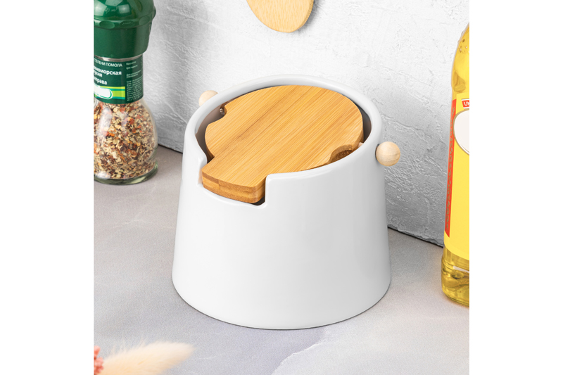 Банка подойдёт для хранения разнообразных сыпучих продуктов на вашей кухне. Размер изделия – 14,5х13,5х11,5 см, объём – 700 мл. Округлая баночка белого цвета выполнена из керамики и имеет откидную крышку из натурального бамбука. Она подойдёт для чая, кофе, сахара и соли. Заполните её специями и приправами, чтобы во время готовки всё необходимое было под рукой. Она также послужит для хранения круп и орехов, конфет, печений и других сладостей. Плотно прилегающая крышка не позволит содержимому просыпаться. Полукруглая выемка на боковой стороне обеспечивает лёгкое поднятие крышки. Благодаря лаконичному дизайну банка впишется в интерьер любой кухни. Не рекомендуется применять абразивные моющие средства. Нельзя использовать в посудомоечной машине и микроволновой печи, нельзя замачивать. Поставляется в прочной картонной упаковке. Банка станет практичным подарком для любой хозяйки и отлично дополнит ваш кухонный инвентарь.