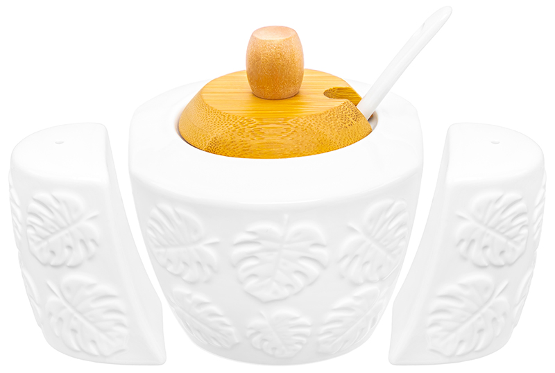 Набор серии "Тропики" состоит из сахарницы на 300 мл, солонки и перечницы на бамбуковой подставке. Размер набора - 16х10х11 см. Сахарница 10х9х10 см имеет крышку из бамбука (высота изделия без крышки – 7 см) и фарфоровую ложку в комплекте. Баночка с ложечкой подойдёт не только для хранения сахара, но и мёда, варенья или джема. Размер солонки и перечницы: 4,5х4х6,7 см каждая баночка (объём по 40 мл). Набор выполнен из белого фарфора и натурального бамбука. Сахарница и ёмкости для специй имеют рельефный узор и станут украшением вашего стола как в будни, так и на праздник. Баночки для специй внизу имеют отверстия для наполнения, которые закрываются пробками. В них можно насыпать соль, перец и любые приправы. Фарфоровые детали без бамбуковых крышки и подставки можно мыть в посудомоечной машине. Изделия из бамбука нельзя замачивать! Столовый набор поставляется в стильной картонной упаковке. Сахарница и набор для специй из серии посуды "Тропики" станет настоящим украшением любой кухни или приятным подарком для ваших близких!