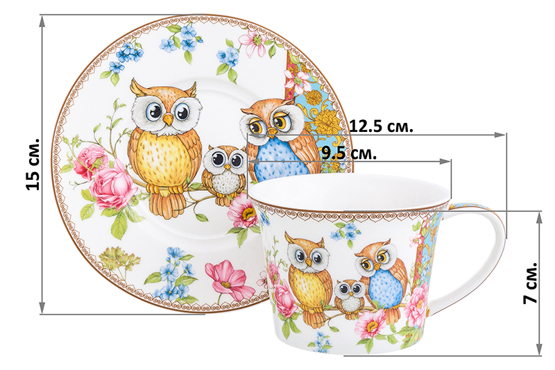 Чайная пара из серии «Совушки» от Elan Gallery предназначена для эстетичной сервировки вашего стола. Размер ёмкости – 12,5х9,5х7 см, объём – 270 мл. Размер блюдца – 15х15х2 см. Выполнены из фарфора нового поколения new bone china, сочетающего в себе изящность и высокую прочность. За счёт гладкости изделия легко отмываются, поэтому сохраняют привлекательный внешний вид и практичны в использовании. Плотная структура материала позволяет посуде дольше сохранять температуру блюд и напитков. От других видов костяного фарфора new bone china отличается большей экологичностью в производстве. Поверхность изделия украшает забавный рисунок: две совы и маленький совёнок с большими глазами сидят на ветке дерева. Нежные бутоны розовых и голубых цветов, а также растительный узор на фоне придают композиции сказочности и тепла. Кофейная кружка поможет вам провести множество приятных завтраков с капучино и латте, а также уютные чайные вечера с десертами и сладостями. Подойдёт ценителям чая и кофе, которые любят пить из красивой и необычной посуды. Согрейтесь зимой любимым напитком: какао с маршмэллоу, ягодным чаем или горячим шоколадом. Летом освежитесь домашним лимонадом или морсом. Используйте сервировочное блюдце как подставку для чашки, чтобы порадовать гостей изящной сервировкой. Положите на неё пирожное, кусочек торта или домашнего пирога. Подойдёт не только для десертов, но и для закусок. Декоративные изделия позволят организовать запоминающееся чаепитие. Не рекомендуется применять абразивные моющие средства. Подходит для использования в микроволновой печи и посудомоечной машине. Поставляется в дизайнерской картонной коробке – благодаря ей вам не потребуется дополнительная подарочная упаковка. Фарфоровая сервировочная посуда будет оригинальным подарком для хозяйки, ценящей не только практичность, но и привлекательность. Серия «Совушки» от бренда Элан Галерея станет украшением любого кухонного инвентаря и позволит собрать красивый сервиз в едином стиле!