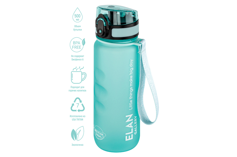 Бутылка для воды и другой жидкости Elan Gallery "Style Matte" в оттенке аквамарин имеет углубления для пальцев и мерную шкалу. Следите за водным балансом и ведите здоровый и активный образ жизни! Объём ёмкости – 500 мл. Питьевая бутылочка выполнена из качественного пластика Usa Tritan. Не содержит бисфенол А и полностью безопасна для здоровья. Подходит для холодных и горячих напитков: воды, сока или чая. Бутыль для питья оснащена ситечком, поильником и клапаном (замком) на крышке. Дорожная бутылка имеет защиту от случайного открывания в сумке или рюкзаке. Имеет ремешок для переноски, что удобно для прогулки или бега. Стильный инвентарь станет незаменимой вещью на отдыхе, в путешествиях или спортзале. Бутылку на ремне с матовым покрытием удобно использовать во время поездок на велосипеде, в автомобиле или во время игры в футбол. Фляга для воды Style matte многоразовая, прочная и легкая, её удобно брать в дорогу или тренажёрный зал. Можно использовать как спорт бутылку для фитнеса и велоспорта, туризма, а также как детскую для школьника на занятиях физкультурой. Не впитывает запахи, не влияет на вкус напитков и легко отмывается. Красивая пластиковая бутылка поможет утолить жажду охлаждённым лимонадом на прогулке, тренировке или в школе. Не подходит для СВЧ, ПММ, стерилизатора. Станет приятным подарком мужчинам и женщинам. Такой сюрприз особенно придётся по вкусу спортсменам: футболисту или любительнице гимнастики и танцев. Станет прекрасным дополнением вашей коллекции походного и туристического инвентаря. В коллекции Elan Gallery представлено много посуды и товаров для дома на любой вкус. Спортивные аксессуары серии Style matte помогут следить за водным балансом и пить любимые напитки, где бы вы ни находились!