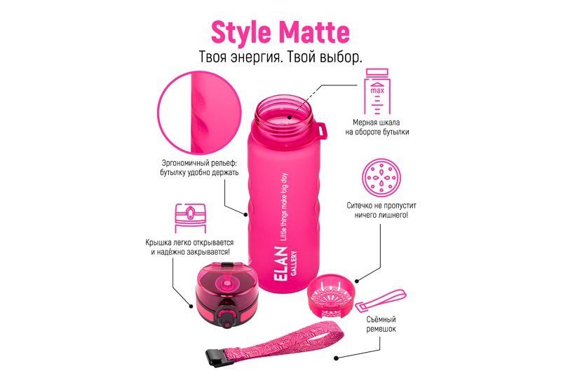 Бутылка для воды «Style Matte» от Elan Gallery – это практичное и стильное решение для ценителей активного образа жизни. Размер ёмкости – 6,5х6,5х23 см. Высота до крышки – 19 см. Объём – 500 мл. Изделие выполнено из тритана – прочного, безопасного материала, не содержащего бисфенол А. Этот пластик не впитывает запахи и не влияет на вкус напитков. Бутылочка подходит как для холодной, так и для горячей жидкости. Освежитесь любимыми летними напитками в жару или согрейтесь ароматным чаем зимой! Матовое покрытие и углубления для пальцев обеспечивают комфортное использование на прогулке, в офисе и на тренировке в зале. Надёжная крышка с герметичным клапаном препятствует проливанию, а встроенное ситечко позволит заваривать напитки с травами и фруктами. С удобным ремешком бутылку можно закрепить на рюкзаке или запястье – это позволяет брать её в путешествия, поездку на велосипеде или автомобиле. Многоразовая дорожная бутылка подходит как для туризма, так и для пикника на природе. Удобная форма делает её не только туристическим, но и спортивным инвентарём. Пластиковая ёмкость для питья – прекрасный вариант для занятий фитнесом, йогой или бегом в спортзале или на свежем воздухе. Она также дополнит занятия велоспортом в качестве велосипедного аксессуара. Это надёжный помощник спортсменам во время игры в футбол или волейбол, занятий гимнастикой и танцами. Подходит как для взрослых, так и для школьников – её можно взять в школу и на занятия физкультурой. Благодаря универсальному дизайну и цвету фуксия она подойдёт как девочкам, так и мальчикам в качестве школьного аксессуара. Функциональная бутылка в дизайнерской картонной упаковке – это готовый подарок для женщин и мужчин. Не подходит для микроволновой печи, посудомоечной машины и стерилизатора. В коллекции бренда Элан Галерея представлена разнообразная посуда и товары для дома на любой вкус. Спортивные аксессуары из серии «Style Matte» помогут следить за водным балансом, где бы вы ни находились!