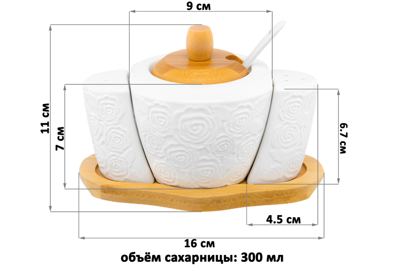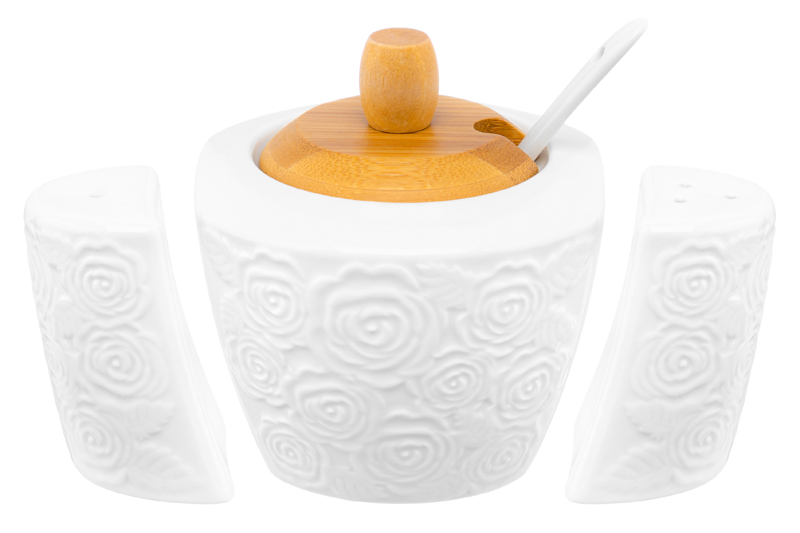 Набор посуды на деревянной подставке из серии «Розы» от Elan Gallery предназначен для эстетичной сервировки вашего стола. Включает в себя сахарницу с ложкой, вазочку под зубочистки и набор для специй. Выполнены из высококачественного белого фарфора. Он не впитывает цвет продуктов и легко отмывается, благодаря чему надолго сохраняет свою белизну. Поверхность изделий украшают рельефные узоры в виде пышных бутонов роз. Подставка и крышка сахарницы выполнены из натурального бамбука. Общий размер набора – 16х10х11 см. Комплект станет воплощением прекрасного вкуса. Размер сахарницы – 10х9х10 см, объём – 300 мл. Ёмкость подойдёт для хранения не только сахара, но и соли, специй и приправ. Засыпьте внутрь чай или кофе, чтобы в любой момент заварить свежий напиток. Подайте её вместе с горячими блюдами, чтобы каждый мог приправить пищу по своему вкусу. Эстетичную ёмкость можно также приспособить под варенье, мёд или икру. Маленькая ложечка позволит удобно набрать необходимое количество продуктов. Она компактно помещается в баночке благодаря выемке на крышке. Такое изделие отлично дополнит сервировку стола как для сытного завтрака, так и для уютного чаепития. Набор для специй позволит держать под рукой необходимые приправы. Наполняются через отверстие снизу и закрываются пластиковой пробкой. Размер каждого изделия – 4,5х4х6,7 см, объём – 40 мл. Не рекомендуется применять абразивные моющие средства. Без бамбуковых элементов ёмкости подходят для использования в микроволновой печи и посудомоечной машине. Поставляются в дизайнерской картонной коробке – благодаря ей вам не потребуется дополнительная подарочная упаковка. Фарфоровая сервировочная посуда будет оригинальным подарком для хозяйки, ценящей не только практичность, но и привлекательность. Серия «Розы» от бренда Элан Галерея станет украшением любого кухонного инвентаря и позволит собрать красивый сервиз в едином стиле!