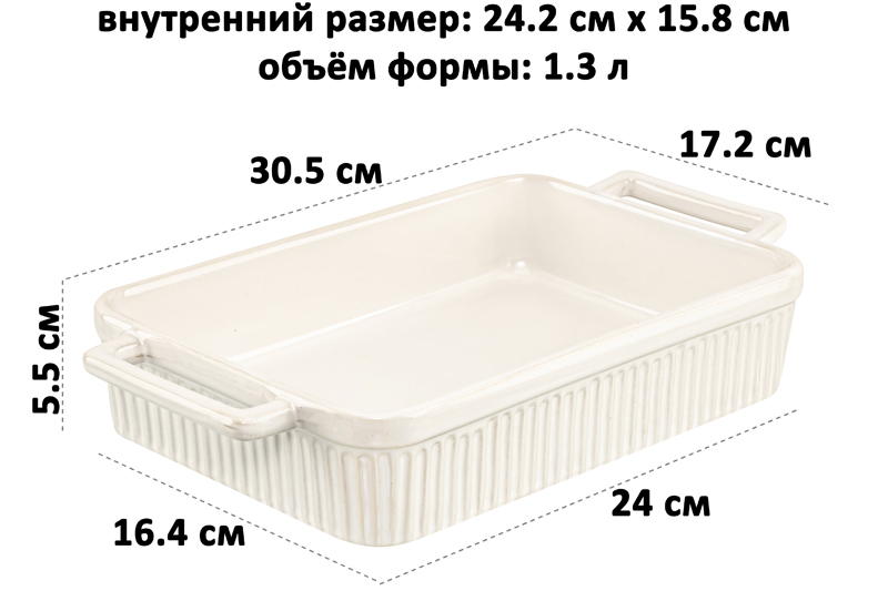 Форма для запекания Elan Gallery "Традиция" объемом 1,3 литра выполнена из фарфора. Размер 30,5×17,2×5,5 см. Внутренний размер 24,2х15,8х4,8 см. Размер без ручек 25,2х17,2х5,5 см, размер дна 24х16,4 см. Фарфоровая ёмкость молочного белого цвета подходит для выпекания в духовке и подачи готового блюда на стол в той же форме. В ней получится чудесная лазанья или выпечка. "Традиция" – это коллекция посуды для запекания, вдохновлённая уютом домашней кухни. Мягкие очертания, нежные оттенки и рельефные узоры навевают атмосферу безмятежности и пробуждают светлые воспоминания. Изделия созданы для любимых блюд по семейным рецептам, которые собирают близких за одним столом. Глубокая тарелка прямоугольной формы удобна для приготовления различных кулинарных шедевров: мясных и овощных запеканок, а также пирога и заливного. Блюдо станет универсальным предметом на кухне: можно использовать для приготовления и сервировки еды. Испеките нежный десерт из творога, а также приготовьте чизкейк, кекс или бисквит. Любители кондитерских изделий оценят удобство при создании творожной выпечки или тирамису. Используйте как контейнер для хранения остатков еды, прикрыв фольгой, либо в роли сервировочного лотка для подачи закусок, хлеба и горячих блюд из мяса и рыбы. Можно использовать как шубницу – для приготовления классической селёдки под шубой или подачи салата. Инструкция: не рекомендуется применять абразивные моющие средства. Избегать резких перепадов температур и механических повреждений. Можно использовать в микроволновой печи, посудомоечной машине и духовом шкафу при температуре до 230 градусов. Запрещено использовать на плите и открытом огне. Кухонный инвентарь станет полезным подарком на праздник. Поставляется в стильной картонной коробке. Благодаря красочной коробочке не понадобится подарочная упаковка, если вы решите сделать сюрприз. В коллекции бренда Элан Галерея представлено много кухонной утвари и других товаров для дома. Выберите вариант на свой вкус!