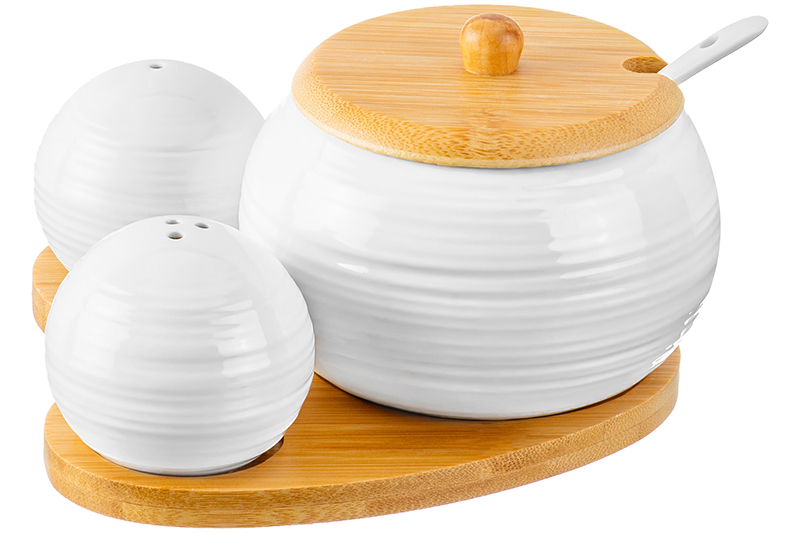 Набор Elan Gallery серии "Шёлк" состоит из сахарницы объёмом 400 мл, солонки и перечницы на бамбуковой подставке. Размер набора - 15х15,5х9 см. Сахарница 11х11х8,5 см имеет крышку из бамбука (высота изделия без крышки – 6,5 см) и фарфоровую ложку в комплекте. Баночка с ложечкой подойдёт не только для хранения сахара, но и мёда, варенья или джема. Размер солонки и перечницы: 6х6х5 см каждая баночка (объём по 70 мл). Набор выполнен из белого фарфора и натурального бамбука. Сахарница и ёмкости для специй имеют рельефный узор в виде полосочек и станут украшением вашего стола как в будни, так и на праздник. Баночки для специй круглой формы внизу имеют отверстия для наполнения, которые закрываются пробками. В них можно насыпать соль, перец или любые приправы. Фарфоровые детали без бамбуковых крышки и подставки можно использовать в микроволновой печи и посудомоечной машине. Изделия из бамбука нельзя замачивать! Столовый набор поставляется в стильной картонной упаковке. Сахарница и набор для специй из серии посуды "Шёлк" станет настоящим украшением любой кухни или приятным подарком для ваших близких!