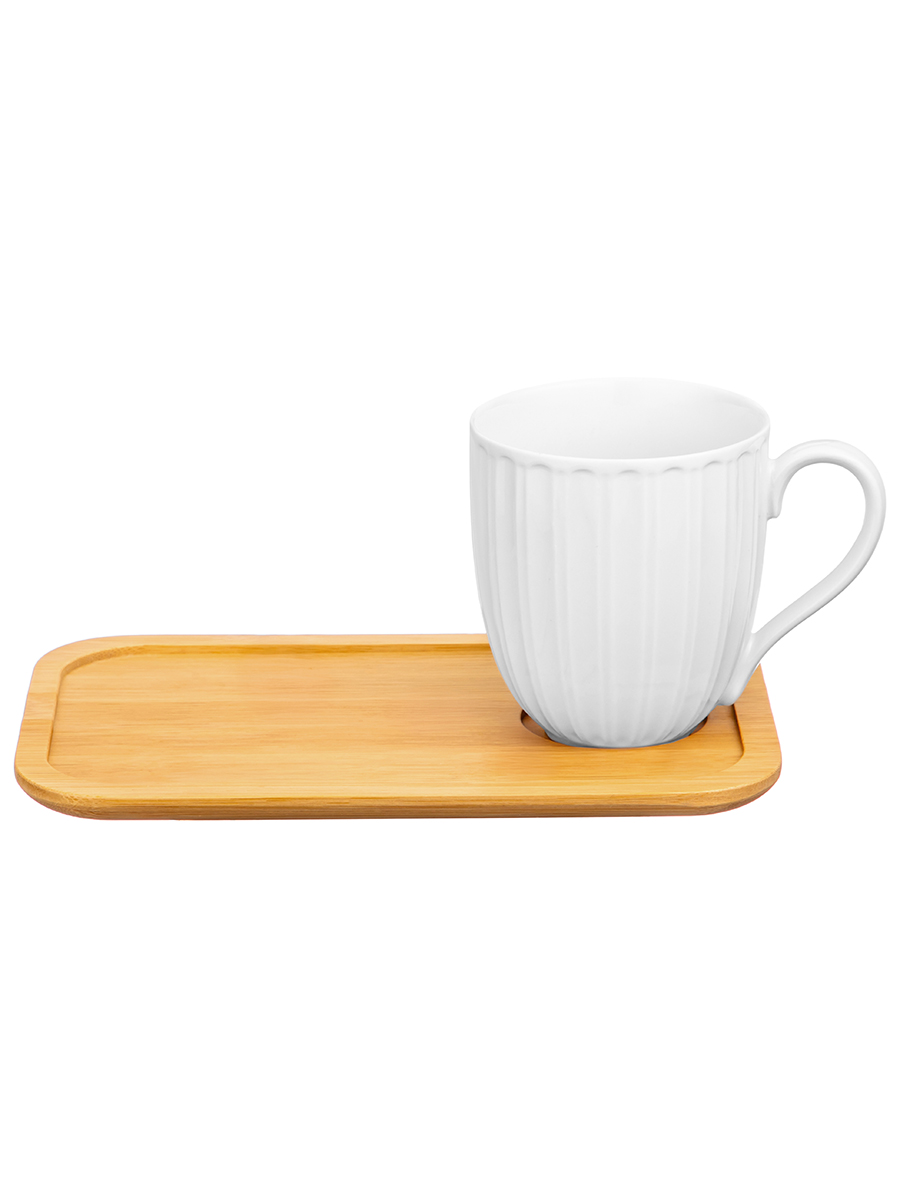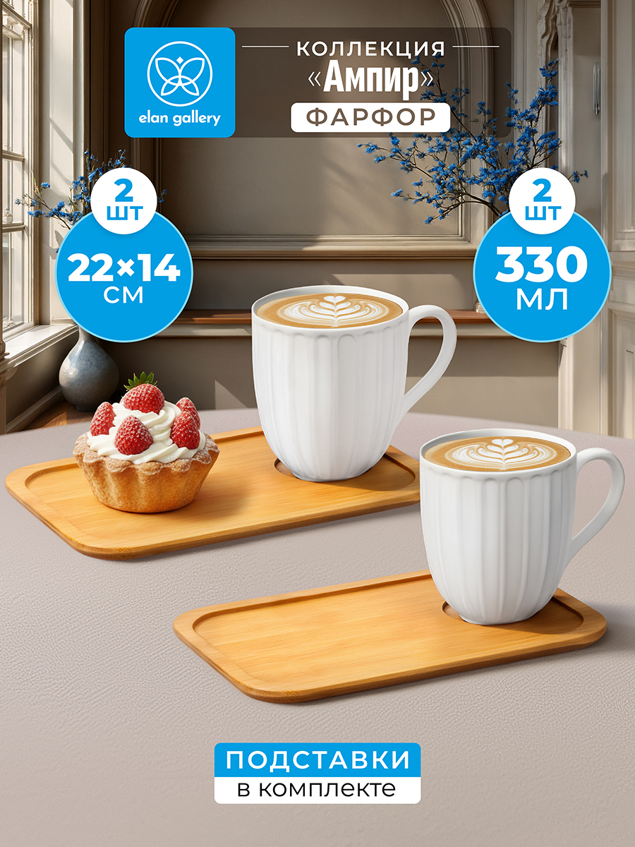Набор 2 кружек с блюдцами для десертов из серии «Ампир» от Elan Gallery предназначен для эстетичной сервировки стола. Размер каждой ёмкости – 12х8,5х9,5 см, объём – 330 мл. Выполнены из высококачественного белого фарфора. Он не впитывает цвет напитков и легко отмывается, благодаря чему надолго сохраняет свою белизну. Поверхность изделий украшает элегантный ребристый рельеф. Блюдца выполнены из натурального бамбука. Размер каждого – 22х14х1 см. Поможет отпраздновать Широкую Масленицу со вкусом! Масленица – это чудесный повод собраться за праздничным столом и насладиться тёплой атмосферой и традиционной русской кухней. В ассортименте бренда Elan Gallery вы найдёте предметы декора и красивую посуду для приготовления и сервировки масленичных блюд. Пусть Масленичная неделя принесет вам радость и множество вкусных моментов! Кофейные кружки помогут вам провести множество приятных завтраков с капучино и латте, а также уютные чайные вечера с конфетами, вафлями, другими десертами и сладостями. Согрейтесь зимой любимым напитком: какао с маршмэллоу, ягодным чаем или горячим шоколадом. Летом освежитесь домашним лимонадом или морсом. Используйте прямоугольные деревянные блюдца как подставку для чашек благодаря круглым выемкам, и одновременно – как десертные тарелочки для пирожных, кусочков торта и других угощений. Не рекомендуется применять абразивные моющие средства. Без бамбуковых блюдец подходят для использования в посудомоечной машине и микроволновой печи. Бамбук нельзя замачивать! Поставляются в дизайнерской картонной коробке – благодаря ей вам не потребуется дополнительная подарочная упаковка. Фарфоровая сервировочная посуда будет оригинальным подарком для хозяйки, ценящей не только практичность, но и привлекательность. Серия «Ампир» от бренда Элан Галерея станет украшением любого кухонного инвентаря и позволит собрать красивый сервиз в едином стиле!