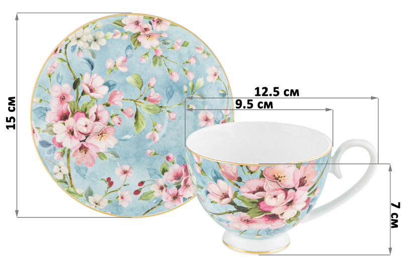 БЫЛО 989 руб! Чайн. пара 2 пр. 300 мл 12,5*9,5*7 см "Яблоневый цвет на голубом" на ножке, NEW BONE CHINA