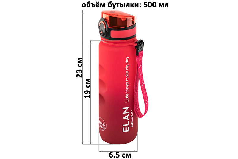 Бутылка для воды и другой жидкости 6,5х6,5х23 см Elan Gallery "Style Matte" со стильным градиентом в оттенке амарант имеет мерную шкалу с отметками по объему. Следите за водным балансом и ведите здоровый и активный образ жизни! Объём ёмкости – 500 мл, высота до крышки 19 см. Питьевая бутылочка выполнена из качественного пластика Usa Tritan. Материал не содержит бисфенол А, не выделяет вредных веществ, не имеет запаха. Подходит для холодных и горячих напитков: воды, сока или чая. На поверхности имеет углубления для пальцев, что обеспечивает удобный захват и предотвращает выскальзывание из рук даже во время бега. Бутыль для питья оснащена ситечком, поильником и клапаном (замком) на крышке. Дорожная бутылка имеет защиту от случайного открывания в сумке или рюкзаке. Ремешок для подвешивания съёмный: отсоедините черное крепление в виде крючка от красного кольца. Стильный инвентарь станет незаменимой вещью на отдыхе, в путешествиях или спортзале. Бутылку на ремне с матовым покрытием удобно использовать во время поездок на велосипеде, в автомобиле или во время игры в футбол. Фляга для воды Style matte многоразовая, прочная и легкая, её удобно брать в дорогу или тренажёрный зал. Можно использовать как спорт бутылку для фитнеса и велоспорта, туризма, а также как детскую для школьника на занятиях физкультурой. Не впитывает запахи, не влияет на вкус напитков и легко отмывается. Красивая пластиковая бутылка поможет утолить жажду охлаждённым лимонадом на прогулке, тренировке или в школе. Не подходит для СВЧ, ПММ, стерилизатора. Станет приятным подарком мужчинам и женщинам. Такой сюрприз особенно придётся по вкусу спортсменам: футболисту или любительнице гимнастики и танцев. Станет прекрасным дополнением вашей коллекции походного и туристического инвентаря. В коллекции Elan Gallery представлено много посуды и товаров для дома на любой вкус. Спортивные аксессуары серии Style matte помогут следить за водным балансом и пить любимые напитки, где бы вы не находились.