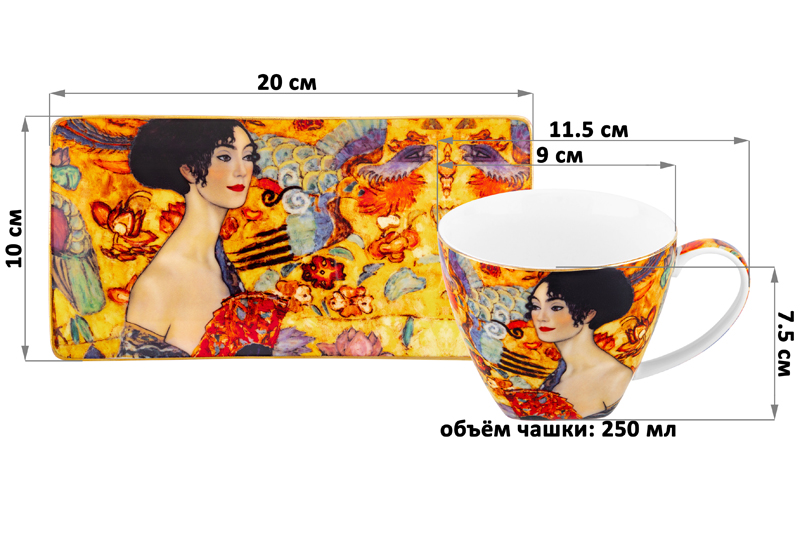 Чашка с блюдцем для десерта Elan Gallery "Дама с веером" выполнены из высококачественного фарфора new bone china. Это фарфор нового поколения, не уступающий традиционному костяному по качеству, но при этом гораздо более экологичный в производстве. Объём чашки – 250 мл, размер блюдца – 20х10х2 см. Чашка и блюдце украшены роскошными репродукциями картины Густава Климта и обрамлены золотым окаймлением. В коллекции бренда Elan Gallery можно найти много красивой посуды и предметов декора с изображениями по мотивам шедевров мировой живописи! Блюдечко имеет необычную прямоугольную форму. Кружка с блюдцем подходят ценителям чая и кофе, которые любят пить из красивой и необычной посуды. Интересная чашка с удобной ручкой украсит ваш стол своим стильным дизайном как на праздник, так и в будни. Это идеальный вариант для того, чтобы согреться горячим чаем зимой и освежиться прохладным лимонадом летом. Используйте блюдце как подставку для чашки, чтобы порадовать гостей изящной сервировкой. Положите на блюдце кусочек торта, домашнего пирога или пирожное. Небольшая тарелочка подойдёт не только для десерта, но и закусок: сырной нарезки, сырокопчёной колбасы или свежих овощей и зелени. Не рекомендуется применять абразивные моющие средства. Набор не подходит для использования в микроволновой печи и посудомоечной машине. Поставляется в красивой картонной упаковке. Станет шикарным подарком вашим близким: маме, бабушке, сестре или подруге на любой праздник. Чашка с десертным блюдцем в жёлтых, красных и тёмных тонах из серии посуды "Дама с веером" сможет стать настоящим украшением вашей кухни или приятным подарком для ценителей искусства!
