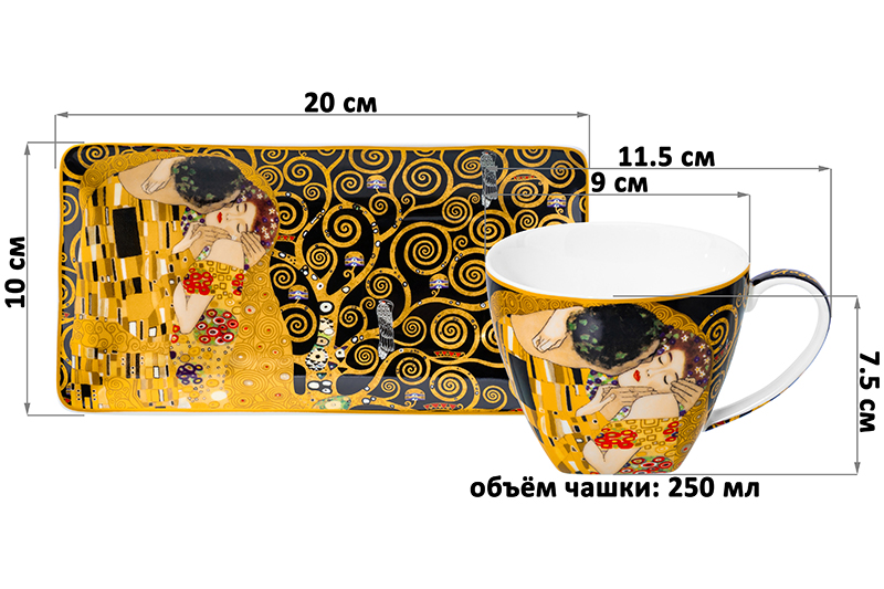 Чашка с блюдцем для десерта Elan Gallery "Поцелуй на чёрном" выполнены из фарфора нового поколения new bone china, украшены изображением в стиле модерн. New bone china сочетает в себе изящность и высокую прочность. От других видов костяного фарфора материал отличается большей экологичностью в производстве. Объём чашки – 250 мл, размер блюдца – 20х10х2 см. Чашка и блюдце украшены роскошными репродукциями картины художника Густава Климта. В коллекции бренда Elan Gallery можно найти много красивой посуды и предметов декора с изображениями по мотивам шедевров мировой живописи! Блюдечко имеет необычную прямоугольную форму. Кружка с блюдцем подходят ценителям чая и кофе, которые любят пить из красивой и необычной посуды. Интересная чашка с удобной ручкой украсит ваш стол своим стильным дизайном как на праздник, так и в будни. Это идеальный вариант для того, чтобы согреться горячим чаем зимой и освежиться прохладным лимонадом летом. Используйте блюдце как подставку для чашки, чтобы порадовать гостей изящной сервировкой. Положите на блюдце кусочек торта, домашнего пирога или пирожное. Небольшая тарелочка подойдёт не только для десерта, но и закусок: сырной нарезки, сырокопчёной колбасы или свежих овощей и зелени. Не рекомендуется применять абразивные моющие средства. Набор можно использовать в микроволновой печи и посудомоечной машине. Поставляется в красивой картонной коробке. Станет приятным подарком вашим близким на любой праздник. Благодаря стильной коробочке не понадобится подарочная упаковка. Чашка с десертным блюдцем станут украшением вашей кухни или приятным сюрпризом для ценителей искусства!