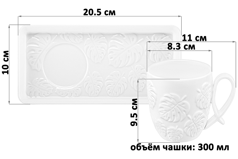 Чашка с блюдцем для десерта Elan Gallery "Тропики" выполнены из фарфора. Объём чашки – 300 мл, размер блюдца – 20,5х10х2 см. Чашка и блюдце украшены изящным рельефным узором. Блюдечко имеет необычную прямоугольную форму. Кружка с блюдцем подходят ценителям чая и кофе, которые любят пить из красивой и необычной посуды. Интересная чашка с удобной ручкой украсит ваш стол своим стильным дизайном как на праздник, так и в будни. Это идеальный вариант для того, чтобы согреться горячим чаем зимой и освежиться прохладным лимонадом летом. Используйте блюдце как подставку для чашки, чтобы порадовать гостей изящной сервировкой. Положите на блюдце кусочек торта, домашнего пирога или пирожное. Небольшая тарелочка подойдёт не только для десерта, но и закусок: сырной нарезки, сырокопчёной колбасы или свежих овощей и зелени. Не рекомендуется применять абразивные моющие средства. Чайную пару можно использовать в микроволновой печи и посудомоечной машине. Поставляется в красивой картонной упаковке. Станет приятным подарком вашим близким на любой праздник. В коллекции бренда Elan Gallery можно найти много красивой посуды, кухонный инвентарь и товары для дома. Серия "Тропики" позволит собрать сервиз в едином стиле и станет настоящим украшением вашей кухни!