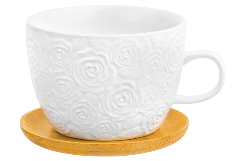 Чашка для капучино и кофе латте Elan Gallery "Розы" объёмом 500 мл выполнена из фарфора. Имеет круглую подставку из натурального бамбука размером 12,8х12,8х1 см. Такая кружечка поможет провести множество приятных завтраков с любимым кофе, а также уютных чайных вечеров. Бокал с рельефным узором подходит ценителям чая и кофе, которые любят пить из красивой и необычной посуды. Это идеальный вариант для того, чтобы согреться горячим напитком зимой и освежиться прохладным лимонадом летом. Кружка с удобной ручкой украсит ваш стол своим интересным дизайном как на праздник, так и в будни. Посуда из белого фарфора идеально впишется в любой интерьер вашей кухни. Фарфоровые чашки отличаются от керамических повышенной плотностью. Они не впитывают цвет кофе, чая, глинтвейна, других горячих напитков и не деформируются от влаги, чему может быть подвержена керамика. Без бамбуковой подставки кружку можно использовать в микроволновой печи и мыть в посудомоечной машине. Бамбук нельзя замачивать! Поставляется в стильной картонной упаковке. Кружка с оригинальным дизайном — идеальный вариант для того, чтобы подарить её близкому человеку на любой праздник. Кофейная кружка на подставке принесёт в дом атмосферу тепла, уюта и станет настоящим украшением вашей кухни.
