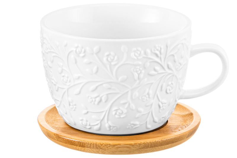 Чашка для капучино и кофе латте Elan Gallery "Веточки-цветочки" объёмом 500 мл выполнена из белого фарфора с рельефным узором. Имеет подставку из бамбука 12,8х12,8х1 см, можно использовать в роли крышки. Общий размер комплекта – 15х12,8х8,5 см. Большой бокал подходит ценителям кофе, которые любят пить из красивой и необычной посуды. Это идеальный вариант для того, чтобы согреться горячим напитком зимой и освежиться прохладным лимонадом летом. Подойдёт для любых напитков, например, чая. Благодаря большому объёму станет незаменимым предметом на долгом чаепитии или чайной церемонии! Широкая кружечка с бамбуковым блюдцем украсит ваш стол своим стильным дизайном как на праздник, так и в будни. Можно использовать в роли чайной пары. Не рекомендуется применять абразивные моющие средства. Без бамбуковой тарелочки (подставки) можно греть в микроволновой печи и мыть в посудомоечной машине. Бамбук нельзя замачивать! Поставляется в картонной коробке. Станет приятным подарком на любой праздник. Благодаря стильной картонной коробочке вам не понадобится дополнительная подарочная упаковка! Серия фарфоровой посуды "Веточки-цветочки" позволит собрать сервиз в едином стиле. В коллекции бренда Elan Gallery представлено красивых товаров для дома. Вы обязательно найдёте что-то на свой вкус!