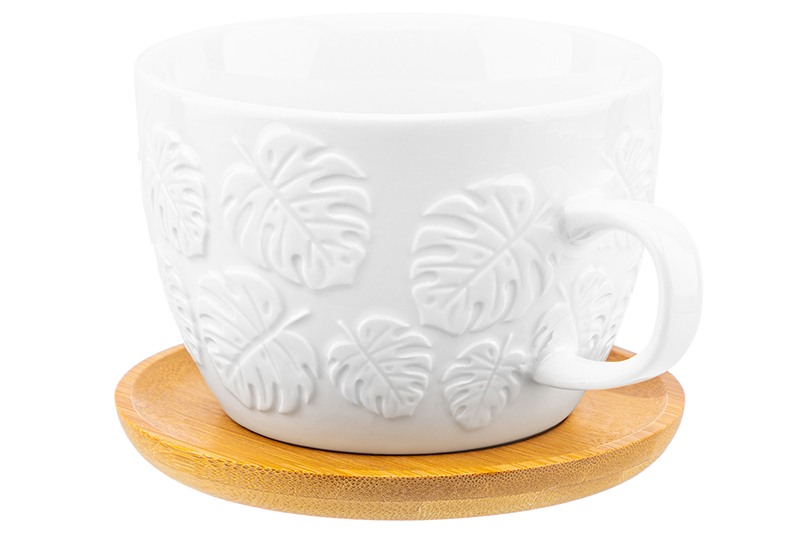 Чашка для капучино и кофе латте Elan Gallery "Тропики" объёмом 500 мл выполнена из фарфора. Имеет круглую подставку из натурального бамбука размером 12,8х12,8х1 см. Такая кружечка поможет провести множество приятных завтраков с любимым кофе, а также уютных чайных вечеров. Бокал подходит ценителям чая и кофе, которые любят пить из красивой и необычной посуды. Это идеальный вариант для того, чтобы согреться горячим напитком зимой и освежиться прохладным лимонадом летом. Кружка с удобной ручкой украсит ваш стол своим интересным дизайном как на праздник, так и в будни. Посуда из белого фарфора идеально впишется в любой интерьер вашей кухни. Фарфоровые чашки отличаются от керамических повышенной плотностью. Они не впитывают цвет кофе, чая, глинтвейна, других горячих напитков и не деформируются от влаги, чему может быть подвержена керамика. Без бамбуковой подставки кружку можно использовать в микроволновой печи и мыть в посудомоечной машине. Бамбук нельзя замачивать! Поставляется в стильной картонной упаковке. Кружка с оригинальным дизайном — идеальный вариант для того, чтобы подарить её близкому человеку на любой праздник. Кофейная кружка на подставке принесёт в дом атмосферу тепла, уюта и станет настоящим украшением вашей кухни.