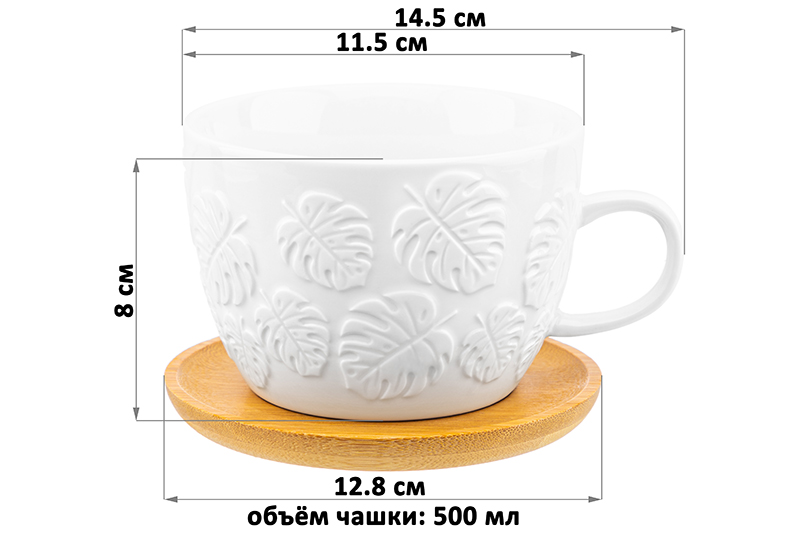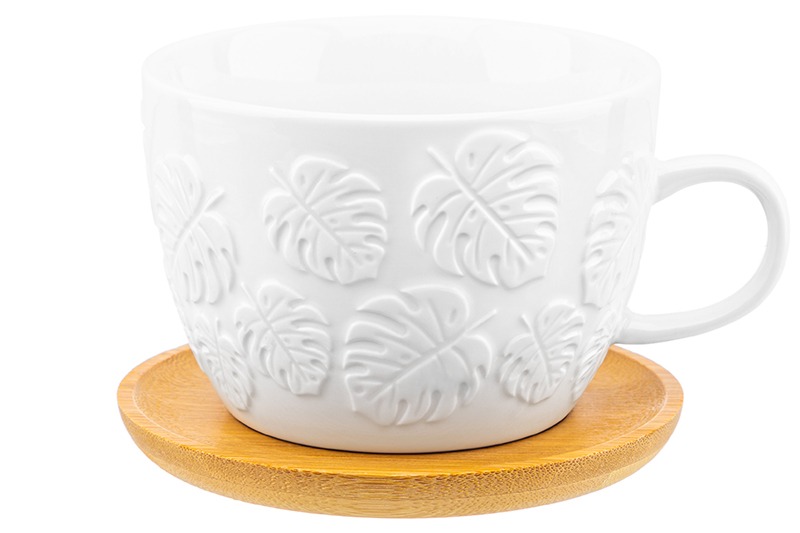 Чашка для капучино и кофе латте Elan Gallery "Тропики" объёмом 500 мл выполнена из фарфора. Имеет круглую подставку из натурального бамбука размером 12,8х12,8х1 см. Такая кружечка поможет провести множество приятных завтраков с любимым кофе, а также уютных чайных вечеров. Бокал подходит ценителям чая и кофе, которые любят пить из красивой и необычной посуды. Это идеальный вариант для того, чтобы согреться горячим напитком зимой и освежиться прохладным лимонадом летом. Кружка с удобной ручкой украсит ваш стол своим интересным дизайном как на праздник, так и в будни. Посуда из белого фарфора идеально впишется в любой интерьер вашей кухни. Фарфоровые чашки отличаются от керамических повышенной плотностью. Они не впитывают цвет кофе, чая, глинтвейна, других горячих напитков и не деформируются от влаги, чему может быть подвержена керамика. Без бамбуковой подставки кружку можно использовать в микроволновой печи и мыть в посудомоечной машине. Бамбук нельзя замачивать! Поставляется в стильной картонной упаковке. Кружка с оригинальным дизайном — идеальный вариант для того, чтобы подарить её близкому человеку на любой праздник. Кофейная кружка на подставке принесёт в дом атмосферу тепла, уюта и станет настоящим украшением вашей кухни.