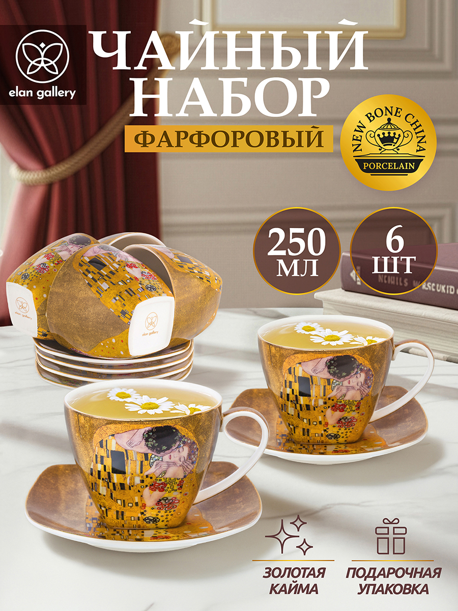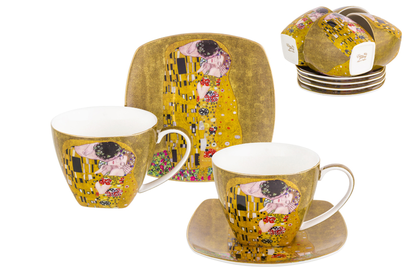 Набор «Поцелуй» состоит из 6-ти чайных пар: 6-ти чашек по 250 мл и 6-ти блюдец. Чайные пары украшены изображением картины художника Густава Климта. Выполнены из высококачественного фарфора New Bone China. Это фарфор нового поколения, не уступающий традиционному костяному фарфору по качеству, но при этом гораздо более экологичный в производстве. Кружки и тарелки украшены золотым окаймлением. Не подходят для использования в микроволновой печи и посудомоечной машине. Набор из 6-ти чайных пар «Поцелуй» поставляется в подарочной упаковке и сможет стать роскошным подарком для родных, близких или коллег! /
