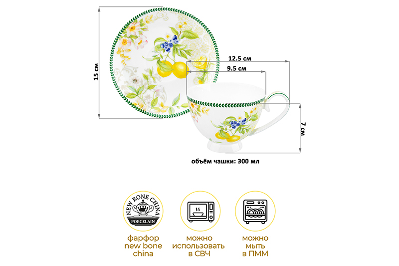 Набор 6 чайных пар из серии «Лимоны» от Elan Gallery предназначен для эстетичной сервировки вашего стола. Размер каждой ёмкости – 12,5х9,5х7 см, объём – 300 мл, размер блюдца – 15х15х2 см. Выполнены из фарфора нового поколения new bone china, сочетающего в себе изящность и высокую прочность. Такие изделия легко отмываются, поэтому сохраняют привлекательный вид и практичны в использовании. Плотная структура материала позволяет посуде дольше сохранять температуру блюд и напитков. От других видов костяного фарфора new bone china отличается большей экологичностью в производстве. Изделия с ярким рисунком лимонов изящно дополнят интерьер любой кухни или столовой, привнеся нотки свежести и солнечного тепла. Кофейные кружки помогут вам провести множество приятных завтраков с капучино и латте, а также уютные чайные вечера с конфетами, вафлями, другими десертами и сладостями. Подойдут ценителям чая и кофе, которые любят пить из красивой и необычной посуды. Согрейтесь зимой любимым горячим напитком: какао с маршмэллоу, ягодным чаем или горячим шоколадом. Летом освежитесь домашним лимонадом или морсом. Используйте сервировочные блюдца как подставки для чашек, чтобы порадовать гостей изящной сервировкой. Положите на десертные тарелки пирожные, кусочки торта или домашнего пирога. Подойдут не только для десертов, но и для закусок: сырной нарезки, сырокопчёной колбасы или свежих овощей и зелени. Декоративные изделия позволят организовать запоминающееся чаепитие в большой компании. Не рекомендуется применять абразивные моющие средства. Подходят для использования в микроволновой печи и посудомоечной машине. Поставляются в стильной картонной коробке – благодаря ей вам не потребуется дополнительная подарочная упаковка. Фарфоровая сервировочная посуда будет оригинальным подарком для хозяйки, ценящей не только практичность, но и привлекательность. Серия «Лимоны» от бренда Элан Галерея станет украшением любого кухонного инвентаря и позволит собрать сервиз в едином стиле!