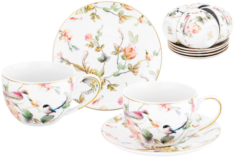 Чайный набор Elan Gallery "Певчие птички" станет украшением вашей кухни. Комплект на 6 персон выполнен из фарфора нового поколения new bone china. За счёт гладкости изделия легко отмываются, поэтому сохраняют привлекательный внешний вид и практичны в использовании. От классического костяного фарфора new bone china отличается большей экологичностью в производстве. Посуда с изображениями птичек и розовых цветов украшена золотистым кантом. Набор состоит из шести чашек объёмами по 250 мл и шести блюдец размерами по 15,3х15,3х2 см. Чайные пары подходят любителям чая и кофе, которые любят пить из красивой и необычной посуды. Благодаря праздничному чайному набору вы можете удивить гостей изящной сервировкой. Используйте блюдца как подставки под чашки. Положите на тарелочки кусочки торта, домашнего пирога или пирожные. Сервировочные тарелки подойдут не только для десерта, но и закусок: сырной нарезки, сырокопчёной колбасы или свежих овощей и зелени. Разместите на каждом блюдце кусочки шашлыка или бутерброды, чтобы угостить гостей. Не рекомендуется применять абразивные моющие средства. Из-за золотого окаймления комплект нельзя использовать в микроволновой печи и мыть в посудомоечной машине. Поставляется в стильной картонной коробке. Благодаря красочной коробочке вам не понадобится дополнительная подарочная упаковка, если вы решите сделать сюрприз своим близким. Чайный набор станет украшением вашей кухни или приятным подарком на любой праздник для тех, кто ценит изящную сервировку. В коллекции бренда Элан Галерея вы найдёте много стильных товаров для дома, кухонного инвентаря и всё для эстетичного чаепития. Выберите варианты на свой вкус!