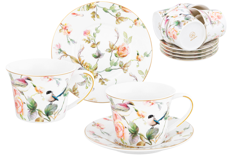Чайный набор Elan Gallery "Певчие птички" станет украшением вашей кухни. Комплект на 6 персон выполнен из фарфора нового поколения new bone china. За счёт гладкости изделия легко отмываются, поэтому сохраняют привлекательный внешний вид и практичны в использовании. От классического костяного фарфора new bone china отличается большей экологичностью в производстве. Посуда с изображениями птичек и розовых цветов украшена золотистым кантом. Набор состоит из шести чашек объёмами по 270 мл и шести блюдец размерами по 15,5х15,5х2 см. Чайные пары подходят любителям чая и кофе, которые любят пить из красивой и необычной посуды. Благодаря праздничному чайному набору вы можете удивить гостей изящной сервировкой. Используйте блюдца как подставки под чашки. Положите на тарелочки кусочки торта, домашнего пирога или пирожные. Сервировочные тарелки подойдут не только для десерта, но и закусок: сырной нарезки, сырокопчёной колбасы или свежих овощей и зелени. Разместите на каждом блюдце кусочки шашлыка или бутерброды, чтобы угостить гостей. Не рекомендуется применять абразивные моющие средства. Из-за золотого окаймления комплект нельзя использовать в микроволновой печи и мыть в посудомоечной машине. Поставляется в стильной картонной коробке. Благодаря красочной коробочке вам не понадобится дополнительная подарочная упаковка, если вы решите сделать сюрприз своим близким. Чайный набор станет украшением вашей кухни или приятным подарком на любой праздник для тех, кто ценит изящную сервировку. В коллекции бренда Элан Галерея вы найдёте много стильных товаров для дома, кухонного инвентаря и всё для эстетичного чаепития. Выберите варианты на свой вкус!