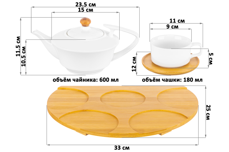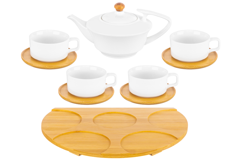 Чайный набор "Кристалл" поможет провести множество приятных чаепитий. В комплект посуды на бамбуковой подставке входят: чайник объемом 600 мл, четыре чашки объемом по 180 мл, четыре блюдечка диаметром по 12 см. Чайник и чашки выполнены из высококачественного фарфора, а блюдца и подставка - из натурального бамбука. Фарфоровая посуда не впитывает цвет напитков и долгое время будет выглядеть, как новая! Чайник в горлышке имеет фильтрующие отверстия против чаинок. Крышка удерживается с помощью язычка. Размер чайника 23,5х15х10,5 см, размер чашки 11х9х5 см. Чашки и чайник без крышки можно использовать в микроволновой печи и посудомоечной машине. Подставку, блюдца и крышку чайника нельзя замачивать и мыть в посудомоечной машине. Набор поставляется в яркой картонной упаковке. Чайный набор "Кристалл" сможет стать настоящим украшением кухни или приятным подарком для ваших родных и близких!