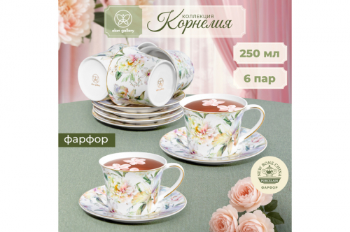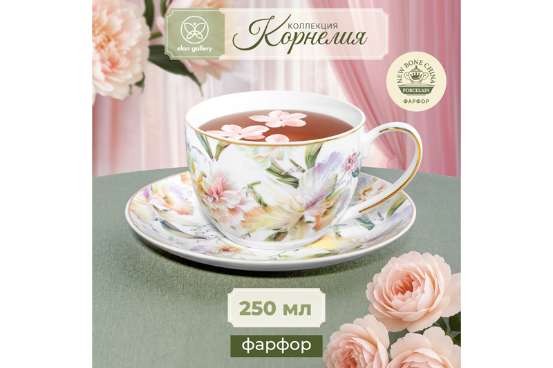 Чайная пара из серии «Корнелия» от Elan Gallery предназначена для эстетичной сервировки вашего стола. Размер изделия – 12,5х9х6,5 см, объём – 250 мл. Размер блюдца – 15,3х15,3х2 см. Изготовлены из фарфора нового поколения new bone china, сочетающего в себе изящность и высокую прочность. За счёт гладкости изделия легко отмываются, поэтому сохраняют привлекательный внешний вид и практичны в использовании. Плотная структура материала позволяет посуде дольше сохранять температуру блюд и напитков. От других видов костяного фарфора new bone china отличается большей экологичностью в производстве. Поверхность изделий овивают изображения обворожительных белых пионов. Они выполнены в манере, вдохновлённой акварельным рисунком. Тонкая золотистая окантовка служит деликатным акцентом и подчёркивает их изысканность. Кофейная кружечка поможет провести множество приятных завтраков с капучино и латте, а также уютные чайные вечера с конфетами, вафлями, другими десертами и сладостями. Подойдёт ценителям чая и кофе, которые любят пить из красивой и необычной посуды. Согрейтесь зимой любимым напитком: какао с маршмэллоу, ягодным чаем или горячим шоколадом. Летом освежитесь домашним лимонадом или морсом. Используйте сервировочное блюдце как подставку для чашки или заполните пирожным, кусочком торта или домашнего пирога. Подойдёт для закусок: сырной нарезки, сырокопчёной колбасы или свежих овощей и зелени. Декоративный комплект позволит организовать запоминающееся чаепитие. Не рекомендуется применять абразивные моющие средства. Не подходят для использования в посудомоечной машине и микроволновой печи. Поставляются в подарочной упаковке. Фарфоровая сервировочная посуда будет оригинальным подарком для хозяйки, ценящей не только практичность, но и привлекательность. Серия «Корнелия» от бренда Элан Галерея добавит вашему кухонному инвентарю лёгкости и элегантности, преобразив любую сервировку!