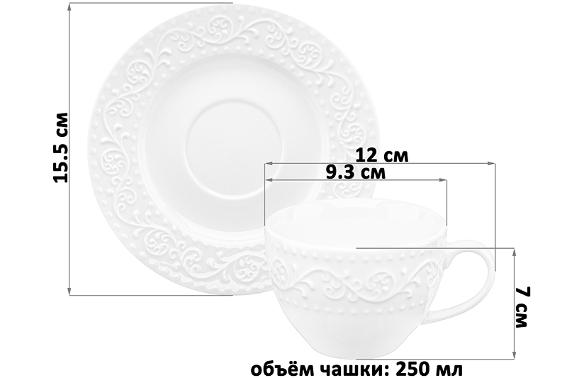 Чайная пара Elan Gallery "Ажур" выполнена из белого фарфора нового поколения new bone china. Он не уступает традиционному костяному фарфору по качеству, но более экологичен в производстве. Состоит из чашки объёмом 250 мл и блюдца размером 15,5х15,5х2 см. Коллекция в классическом стиле украшена изящным рельефным узором. Чайная пара подходит для любителей чая и кофе. Вы сможете насладиться любимыми напитками из красивой кружки и удивить своих гостей. Используйте блюдце как подставку под чашку. Положите на тарелочку кусочек торта, домашнего пирога или пирожное. Сервировочная тарелка подойдёт не только для десерта, но и закусок: сырной нарезки, сырокопчёной колбасы или свежих овощей и зелени. Изделия из белого фарфора идеально впишутся в любой интерьер вашей кухни. Разместите на блюде кусочки шашлыка или бутерброды, чтобы перекусить за чашечкой кофе. Не рекомендуется применять абразивные моющие средства. Можно использовать в микроволновой печи и мыть в посудомоечной машине. Поставляется в картонной коробке. Фарфоровая посуда – хороший вариант подарка любой женщине. Благодаря красочной коробочке не понадобится дополнительная подарочная упаковка. Особенно понравится любителям посуды в скандинавском стиле. В коллекции бренда Elan Gallery представлено много товаров для дома на любой вкус. Добавьте элегантности любому приёму пищи благодаря классической посуде с изящным дизайном!
