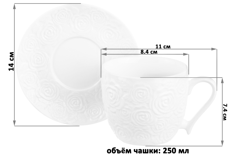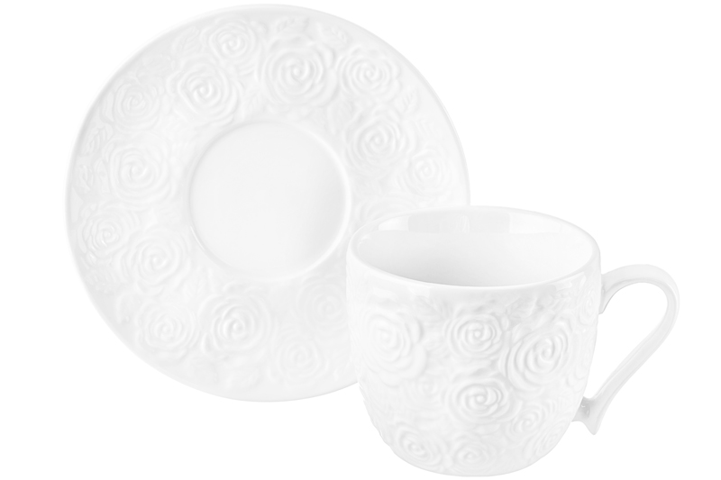 Чайная пара "Розы" из чашки и блюдца подойдет для чая или кофе. Изящный нейтральный стиль позволит дополнить данной парой любой сервиз. Чашка и блюдце выполнены из качественного белоснежного фарфора и украшены узорами из роз. Можно использовать в микроволновой печи и посудомоечной машине. В серии посуды из белого фарфора представлен широкий ассортимент товаров для сервировки стола, которые, несомненно, впишутся в любой интерьер благодаря лаконичному дизайну, натуральным материалам и высокой функциональности. Такому подарку будет рада любая хозяйка!