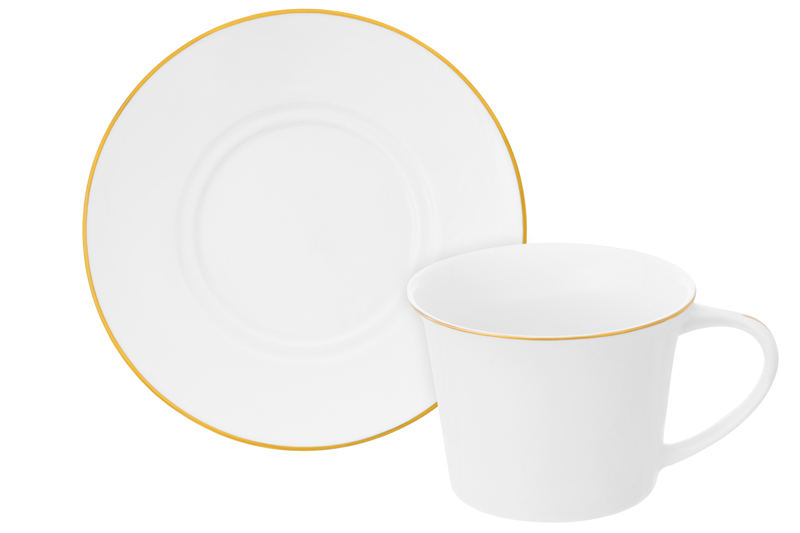 Чайная пара из серии «Белая с золотом» предназначена для красивой сервировки стола. Размер ёмкости – 12,5х9,5х7 см, объём – 270 мл. Размер блюдца – 15х15х2 см. Выполнены из фарфора нового поколения new bone china, сочетающего в себе изящность и высокую прочность. За счёт гладкости изделия легко отмываются, поэтому сохраняют привлекательный вид и практичны в использовании. Плотная структура материала позволяет посуде дольше сохранять температуру блюд и напитков. От других видов костяного фарфора new bone china отличается большей экологичностью в производстве. Белая фарфоровая посуда с элегантным золотистым кантом станет изящным дополнением интерьера любой кухни, столовой и гостиной. Кофейная кружка поможет провести множество приятных завтраков с капучино или латте, а также уютные чайные вечера с конфетами, вафлями, другими десертами и сладостями. Подойдёт ценителям чая и кофе, которые любят пить из красивой и необычной посуды. Согрейтесь зимой любимым горячим напитком: какао с маршмэллоу, ягодным чаем, горячим шоколадом. Летом освежитесь домашним лимонадом или морсом. Используйте сервировочное блюдце как подставку для чашки, чтобы порадовать гостей изящной сервировкой. Положите на десертную тарелку пирожное, кусочек торта или домашнего пирога. Подойдёт не только для десертов, но и для закусок: сырной нарезки, сырокопчёной колбасы или свежих овощей и зелени. Декоративные изделия добавят эстетики любому чаепитию. Не рекомендуется применять абразивные моющие средства. Не подходят для использования в микроволновой печи и посудомоечной машине. Поставляются в картонной коробке. Фарфоровая сервировочная посуда послужит оригинальным подарком для хозяйки, ценящей не только практичность, но и привлекательность. Серия «Белая с золотом» станет украшением любого кухонного инвентаря и позволит собрать сервиз в едином стиле!