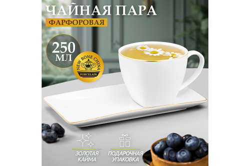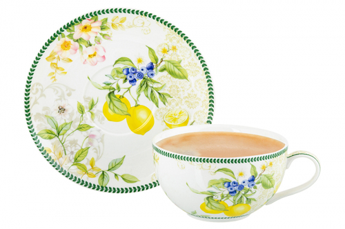 Чайная пара из серии «Лимоны» станет стильным дополнением вашей кухни. Размер кружки – 12,5х9,5х7 см, объём – 250 мл. Размер блюдца – 15х15х2 см. Выполнены из фарфора new bone china, сочетающего в себе изящность и высокую прочность. За счёт гладкости изделия легко отмываются, поэтому долго сохраняют привлекательный вид и практичны в использовании. Плотная структура материала позволяет посуде дольше сохранять температуру блюд и напитков. От других видов костяного фарфора new bone china отличается большей экологичностью в производстве. Фарфоровая посуда с ярким рисунком в виде лимонов станет изящным дополнением интерьера любой кухни или столовой. Чашка поможет провести множество приятных завтраков с капучино или латте, а также уютные чайные вечера с конфетами, вафлями или другими сладостями. Подойдёт ценителям чая и кофе, которые любят пить из красивой и необычной посуды. Согрейтесь зимой любимым горячим напитком: какао с маршмэллоу, ягодным чаем, горячим шоколадом, или освежитесь лимонадом летом. Используйте сервировочное блюдце как подставку для чашки, чтобы порадовать гостей изящной сервировкой. Положите на него пирожное, кусочек торта или домашнего пирога. Небольшая тарелочка подойдёт не только для десертов, но и для закусок: сырной нарезки, сырокопчёной колбасы или свежих овощей и зелени. Не рекомендуется применять абразивные моющие средства. Подходит для использования в посудомоечной машине и микроволновой печи. Поставляется в красивой картонной коробке – благодаря ей вам не потребуется дополнительная подарочная упаковка. Набор станет оригинальным подарком для любой хозяйки и незаменимым элементом сервировочного инвентаря в вашем доме!