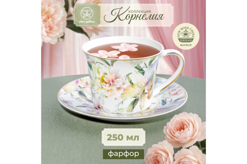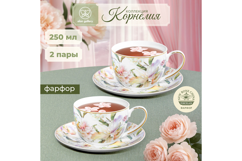 Набор 2 чайных пар из серии «Корнелия» от Elan Gallery предназначен для эстетичной сервировки вашего стола. Размер каждой ёмкости – 12,5х9х6,5 см, объём – 250 мл. Размер каждого блюдца – 15,3х15,3х2 см. Изготовлены из фарфора нового поколения new bone china, сочетающего в себе изящность и высокую прочность. За счёт гладкости изделия легко отмываются, поэтому сохраняют привлекательный внешний вид и практичны в использовании. Плотная структура материала позволяет посуде дольше сохранять температуру блюд и напитков. От других видов костяного фарфора new bone china отличается большей экологичностью в производстве. Поверхность изделий овивают изображения обворожительных белых пионов. Они выполнены в манере, вдохновлённой акварельным рисунком. Тонкая золотистая окантовка служит деликатным акцентом и подчёркивает их изысканность. Кофейные кружечки помогут провести множество приятных завтраков с капучино и латте, а также уютные чайные вечера с конфетами, вафлями, другими десертами и сладостями. Подойдут ценителям чая и кофе, которые любят пить из красивой и необычной посуды. Согрейтесь зимой любимым напитком: какао с маршмэллоу, ягодным чаем или горячим шоколадом. Летом освежитесь домашним лимонадом или морсом. Используйте сервировочные блюдца как подставки для чашек или заполните пирожными, кусочками торта и домашнего пирога. Подойдут для закусок: сырной нарезки, сырокопчёной колбасы или свежих овощей и зелени. Декоративный комплект позволит организовать запоминающееся чаепитие в большой компании. Не рекомендуется применять абразивные моющие средства. Не подходят для использования в посудомоечной машине и микроволновой печи. Поставляются в подарочной упаковке. Фарфоровая сервировочная посуда будет оригинальным подарком для хозяйки, ценящей не только практичность, но и привлекательность. Серия «Корнелия» от бренда Элан Галерея добавит вашему кухонному инвентарю лёгкости и элегантности, преобразив любую сервировку!
