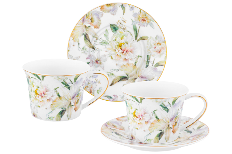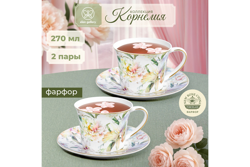 Набор 2 чайных пар из серии «Корнелия» от Elan Gallery предназначен для эстетичной сервировки вашего стола. Размер каждой ёмкости – 12,5х9,5х7 см, объём – 270 мл. Размер каждого блюдца – 15х15х2 см. Изготовлены из фарфора нового поколения new bone china, сочетающего в себе изящность и высокую прочность. За счёт гладкости изделия легко отмываются, поэтому сохраняют привлекательный внешний вид и практичны в использовании. Плотная структура материала позволяет посуде дольше сохранять температуру блюд и напитков. От других видов костяного фарфора new bone china отличается большей экологичностью в производстве. Поверхность изделий овивают изображения обворожительных белых пионов. Они выполнены в манере, вдохновлённой акварельным рисунком. Тонкая золотистая окантовка служит деликатным акцентом и подчёркивает их изысканность. Кофейные кружечки помогут провести множество приятных завтраков с капучино и латте, а также уютные чайные вечера с конфетами, вафлями, другими десертами и сладостями. Подойдут ценителям чая и кофе, которые любят пить из красивой и необычной посуды. Согрейтесь зимой любимым напитком: какао с маршмэллоу, ягодным чаем или горячим шоколадом. Летом освежитесь домашним лимонадом или морсом. Используйте сервировочные блюдца как подставки для чашек или заполните пирожными, кусочками торта и домашнего пирога. Подойдут для закусок: сырной нарезки, сырокопчёной колбасы или свежих овощей и зелени. Декоративный комплект позволит организовать запоминающееся чаепитие в большой компании. Не рекомендуется применять абразивные моющие средства. Не подходят для использования в посудомоечной машине и микроволновой печи. Поставляются в подарочной упаковке. Фарфоровая сервировочная посуда будет оригинальным подарком для хозяйки, ценящей не только практичность, но и привлекательность. Серия «Корнелия» от бренда Элан Галерея добавит вашему кухонному инвентарю лёгкости и элегантности, преобразив любую сервировку!