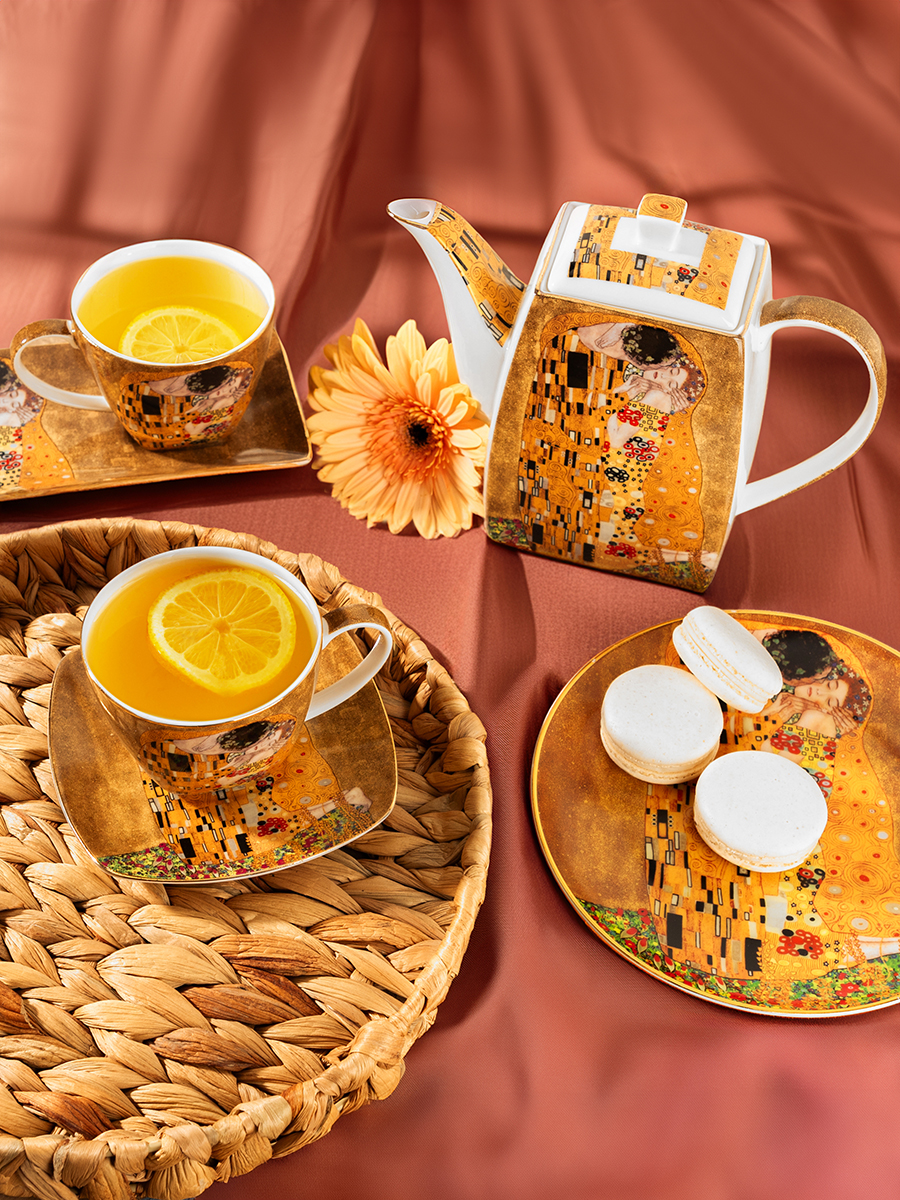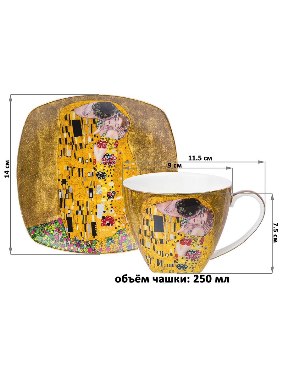 Чайная пара из серии «Поцелуй» от Elan Gallery предназначена для эстетичной сервировки вашего стола. Размер ёмкости – 11,5х9х7,5 см, объём – 250 мл. Размер блюдца – 14х14х1 см. Выполнены из фарфора нового поколения new bone china, сочетающего в себе изящность и высокую прочность. За счёт гладкости изделия легко отмываются, поэтому сохраняют привлекательный внешний вид и практичны в использовании. Плотная структура материала позволяет посуде сохранять температуру блюд и напитков. От других видов костяного фарфора new bone china отличается большей экологичностью в производстве. Изделия украшены роскошной репродукцией картины художника Густава Климта. В коллекции можно найти много красивой посуды и предметов декора с изображениями по мотивам шедевров мировой живописи! Кофейная кружка поможет провести множество приятных завтраков с капучино и латте, а также уютные чайные вечера с конфетами, вафлями, другими десертами и сладостями. Подойдёт ценителям чая и кофе, которые любят пить из красивой и необычной посуды. Согрейтесь зимой любимым напитком: какао с маршмэллоу, ягодным чаем или горячим шоколадом. Летом освежитесь домашним лимонадом или морсом. Используйте сервировочное блюдце как подставку для чашки, порадовав гостей изящной сервировкой. Положите на десертную тарелку пирожное, кусочек торта или домашнего пирога. Подойдёт не только для десертов, но и для закусок: сырной нарезки, сырокопчёной колбасы или свежих овощей и зелени. Не рекомендуется применять абразивные моющие средства. Не использовать в посудомоечной машине и микроволновой печи. Поставляются в дизайнерской картонной коробке – благодаря ей вам не потребуется дополнительная подарочная упаковка. Фарфоровая сервировочная посуда послужит оригинальным подарком для хозяйки, ценящей не только практичность, но и привлекательность. Серия «Поцелуй» от бренда Элан Галерея станет украшением любого кухонного инвентаря и позволит собрать сервиз в едином стиле!