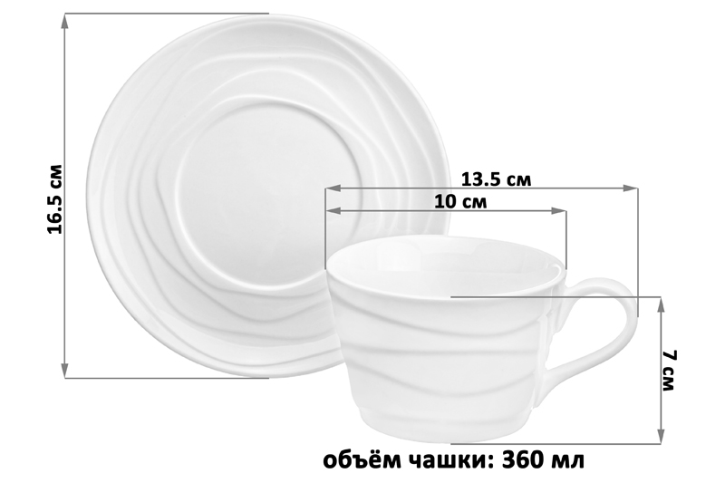 Чайная пара серии "Айсберг волны" состоит из чашки объемом 360 мл и блюдца диаметром 16,5 см. Чашка и блюдце выполнены из высококачественного фарфора и украшены рельефными узорами. Чайная пара подходит для любых напитков, горячих и холодных: чая, кофе, соков, лимонадов. Фарфоровая посуда не впитывает цвет напитков и не деформируется от влаги. Она долгое время будет выглядеть, как новая! Чайную пару можно использовать в микроволновой печи и посудомоечной машине. Набор поставляется в яркой картонной упаковке. Чайная пара из серии посуды "Айсберг волны" сможет стать настоящим украшением кухни или приятным подарком для ваших родных и близких!
